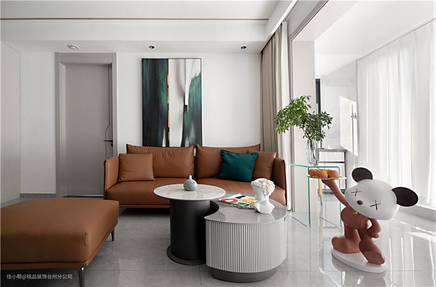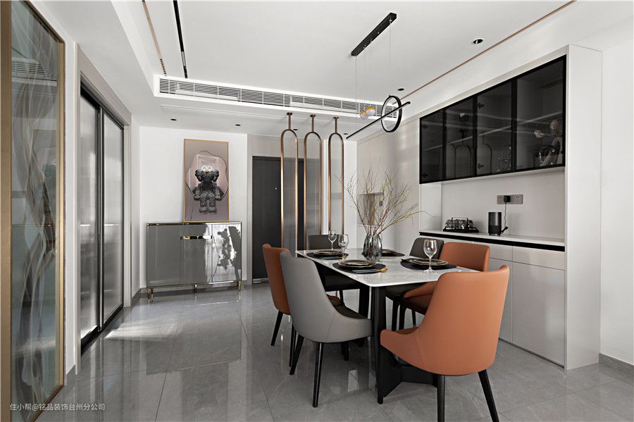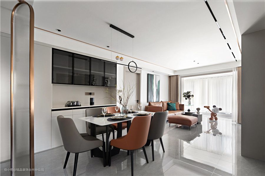 餐桌居中紧靠玄关隔断,客餐厅采用双向环形动线缩短行动路径,在高效使用空间的同时,也让空间流动了起来。客厅的无主灯设计简约而不失高级。