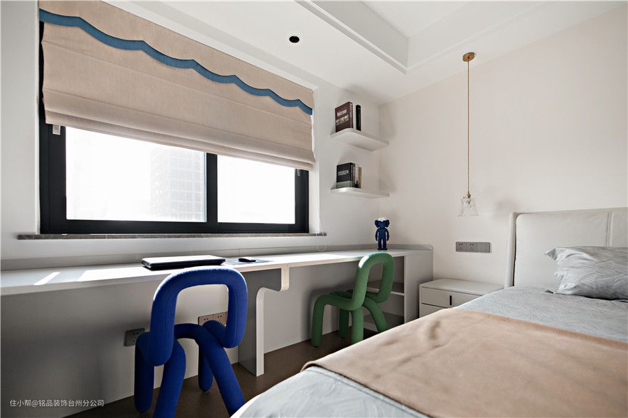 整个空间大面积白色和其他活泼鲜艳的颜色点缀,设计了独立的休息区,还有一整面墙衣柜收纳孩子们的衣物。