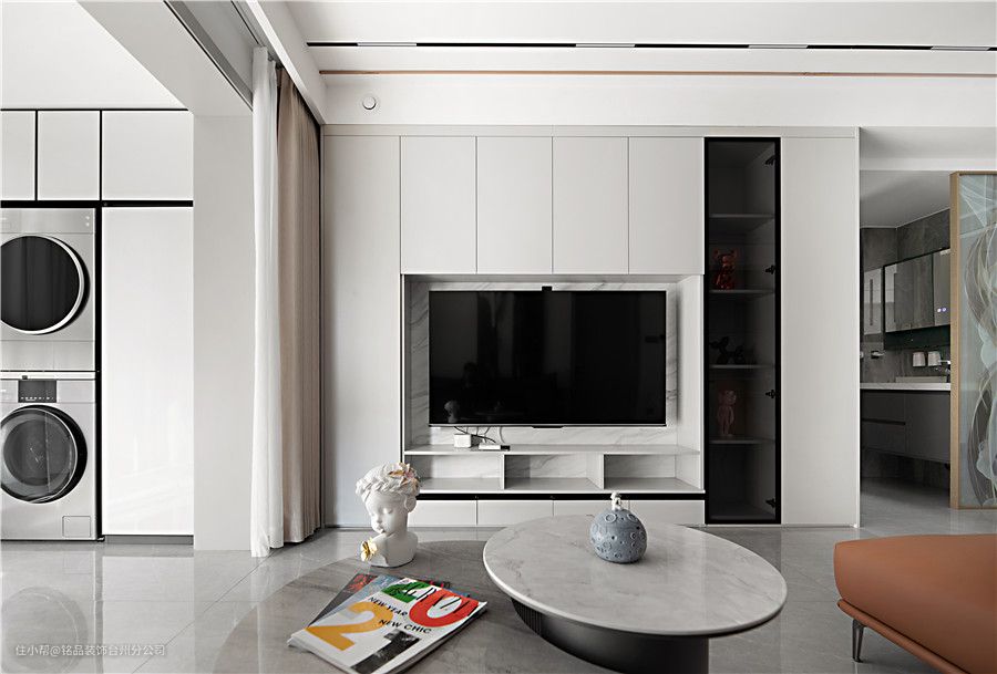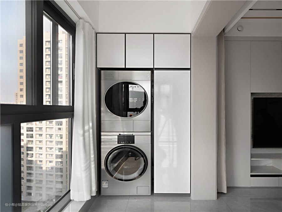 阳台的设计非常独特,取消阳台和客厅之间的隔断,打通阳台包进客厅,空间感瞬间大了起来。客厅的瓷砖地板通铺到阳台,安装洗衣机和烘干机叠加,取消晾衣架,挂满衣服的阳台太影响美观。