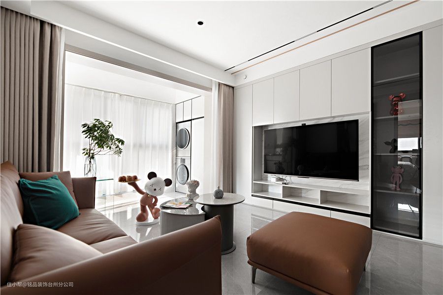 客厅与阳台打通并与次卧阳台一起组合成为功能满满的生活阳台,超大的落地窗采光给予空间完美的舒适体验!客厅的无主灯设计让整个空间的现代感充盈了起来,而且电视背景墙融入隐形柜以及灰玻饰面柜格,多元化的呈现,让收纳也变得优雅精致了呢。