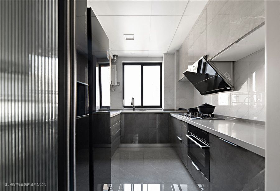 厨房的面积不大,做的是一条U型烹饪动态线。超长空间也是能完全采光的,一体式高底柜,然后放置一套双门冰箱,以黑白为主色调,清新精致。