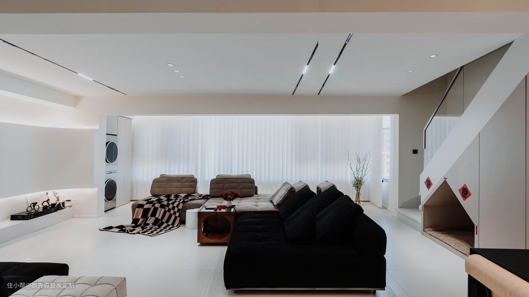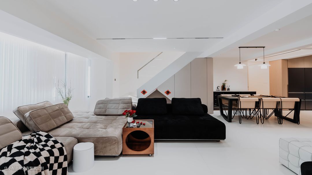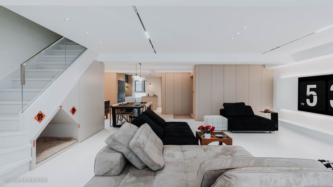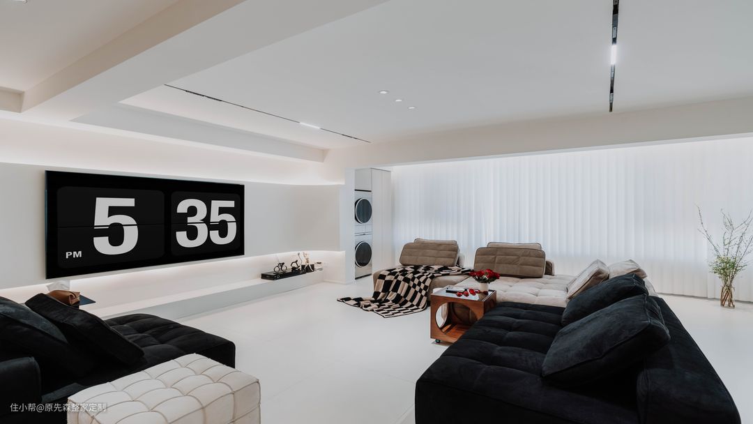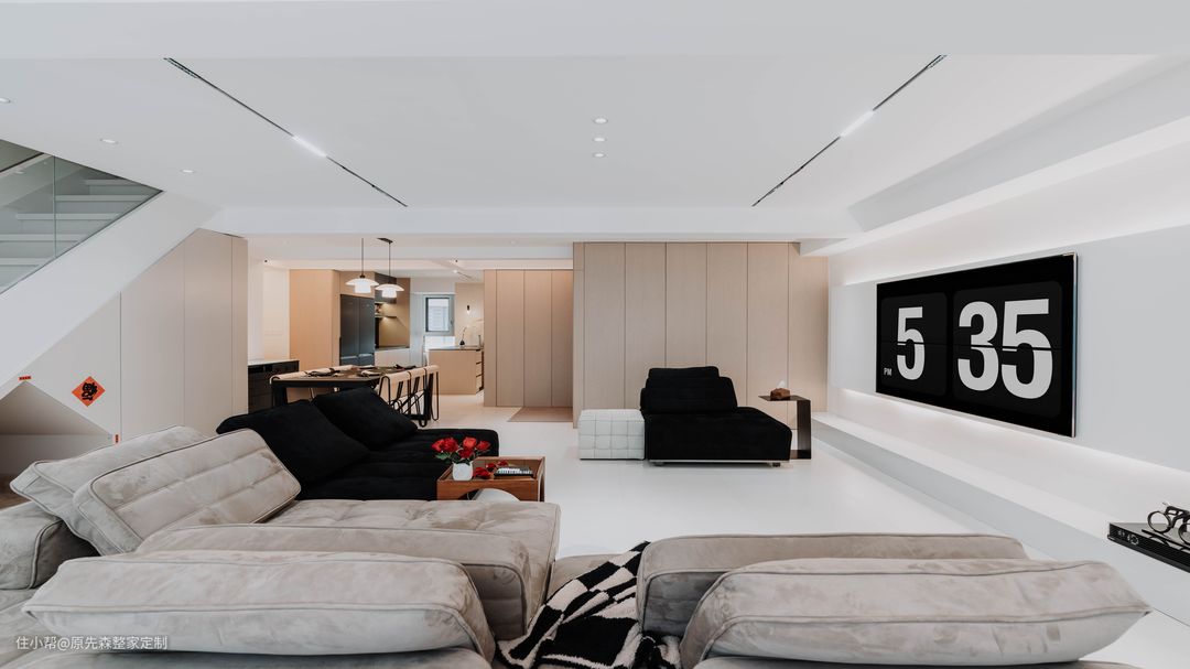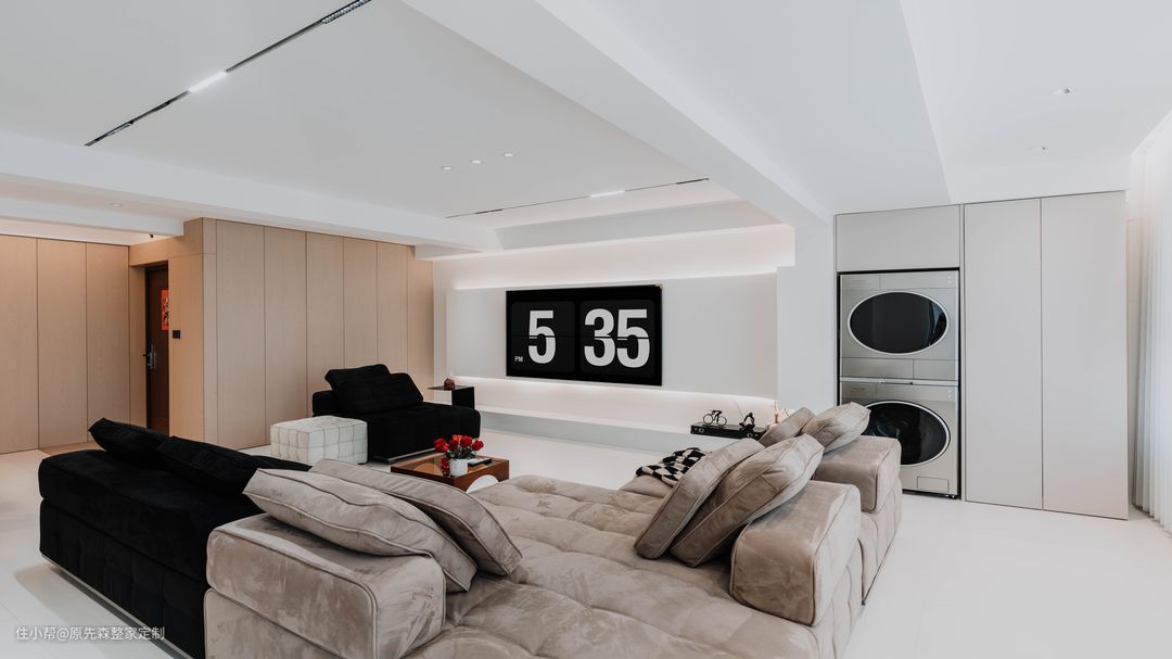经典黑白灰的色调搭配,色彩鲜明具有强烈的对比性,功能分区明确空间功能性强;简约并不等于简单,而是将多余没有用的东西舍弃掉,更加注重功能性,实用性更强的用品,这样还节约了装修的成本; 电视背景墙采用悬浮墙体设计,电视安装在悬浮墙体上,使得电视背景墙具有超强的空间层次感以及设计感,墙体后嵌隐藏式的灯带;晚上时分,将其他灯关掉,客厅就是一个温馨的“影院”,提供一个舒适的观影环境。 墙体定制了原木色的护墙板,给空间增添了几分温柔,住起来也会更舒适;护墙板还可以起到保护墙体的作用,相比于乳胶漆或者墙纸来说,护墙板更加耐用,使用年限长,也更加环保;还可以起到部分隔音效果,居住体验感更好~ 吊顶采用的是当下主流的两边吊顶,两边吊顶的好处便是不压层高,避免了灰尘的堆积,减少清洁降低家务压力;边吊安装射灯,可以辅助照明,天花板安装了轨道灯以及暗装筒灯,筒灯打亮了下方的茶几,轨道灯可以使客厅的光源更加均匀,保护眼睛。