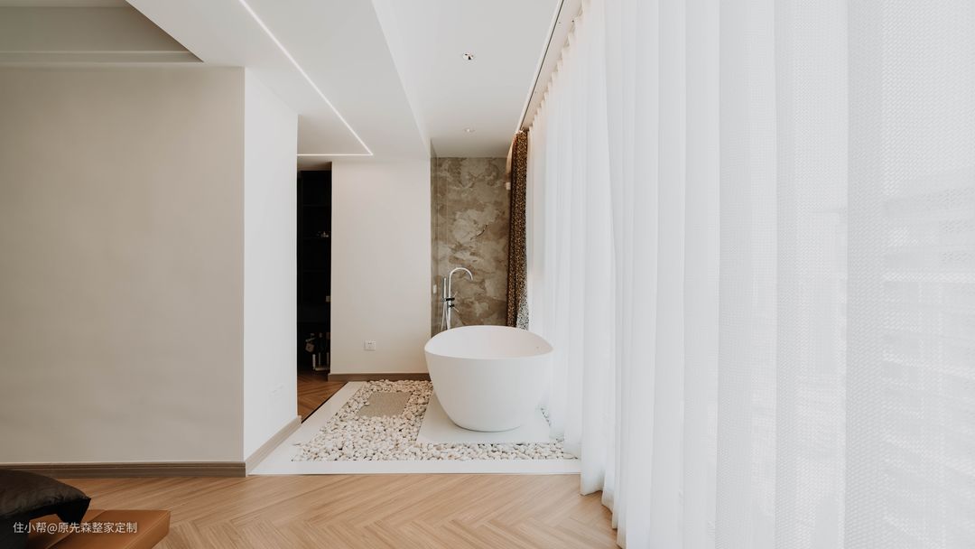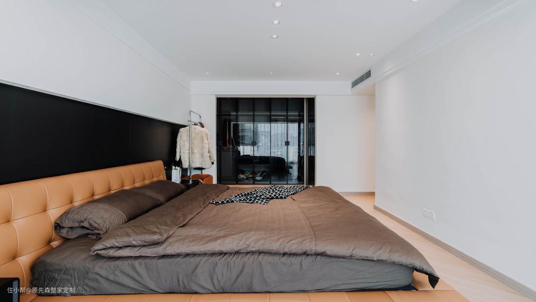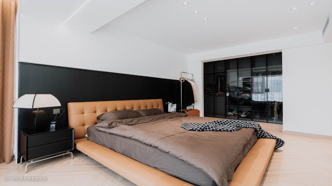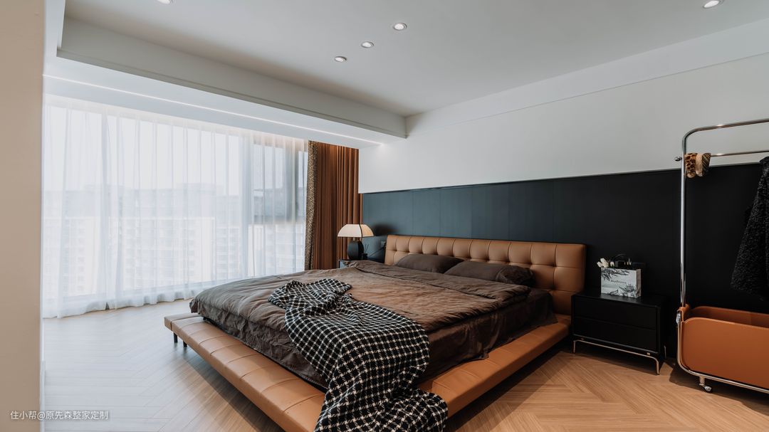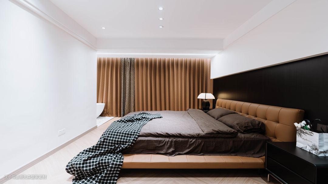 主卧一整面的落地窗,使得主卧的视野十分开阔,地台床相比于传统的床而言,收纳空间会更好,在地台的内部拥有一个储物空间;地台床的使用也更加灵活,地台部分可以当做沙发使用,看起来也更加美观,可以与室内的装修很好地搭配,使得装修效果更好; 主卧的色调搭配与整家相同,黑色搭配上浅咖色,不仅不会使主卧显得压抑,还会使主卧高级感满满;主卧的旁边是一个小次卧,但是设计师巧妙地将其改造成为了衣帽间,采用了衣柜+梳妆台的设计,梳妆台也可以作为书桌使用,衣帽间也多了“书房”的作用,真正地做到了“一房顶多房”。 在阳台部分,安置了一个浴缸,无需担心隐私问题,安装的防偷窥玻璃便可以轻松解决这个难题;晚上时分,在浴缸中悠闲地泡着澡,然后观赏着窗外的美景,该是一件多么惬意的事情~