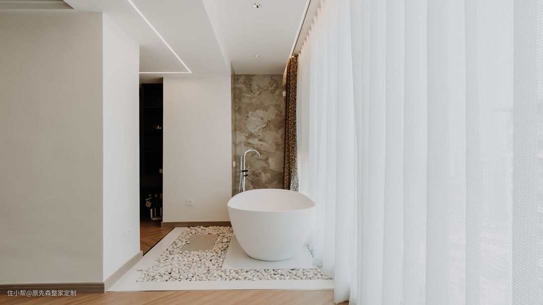主卧阳台设立了一个泡澡区,地面铺设了白色的鹅卵石,使得好像身处在沙滩一般,情趣无比;卫生间内安装了壁挂式的置物架,牙刷,漱口杯等洗漱用品可以得到很好的收纳,显得干净整洁;左边和右边都预留安装了插座,方便吹风机,卷发棒等用品的使用,便利了生活。