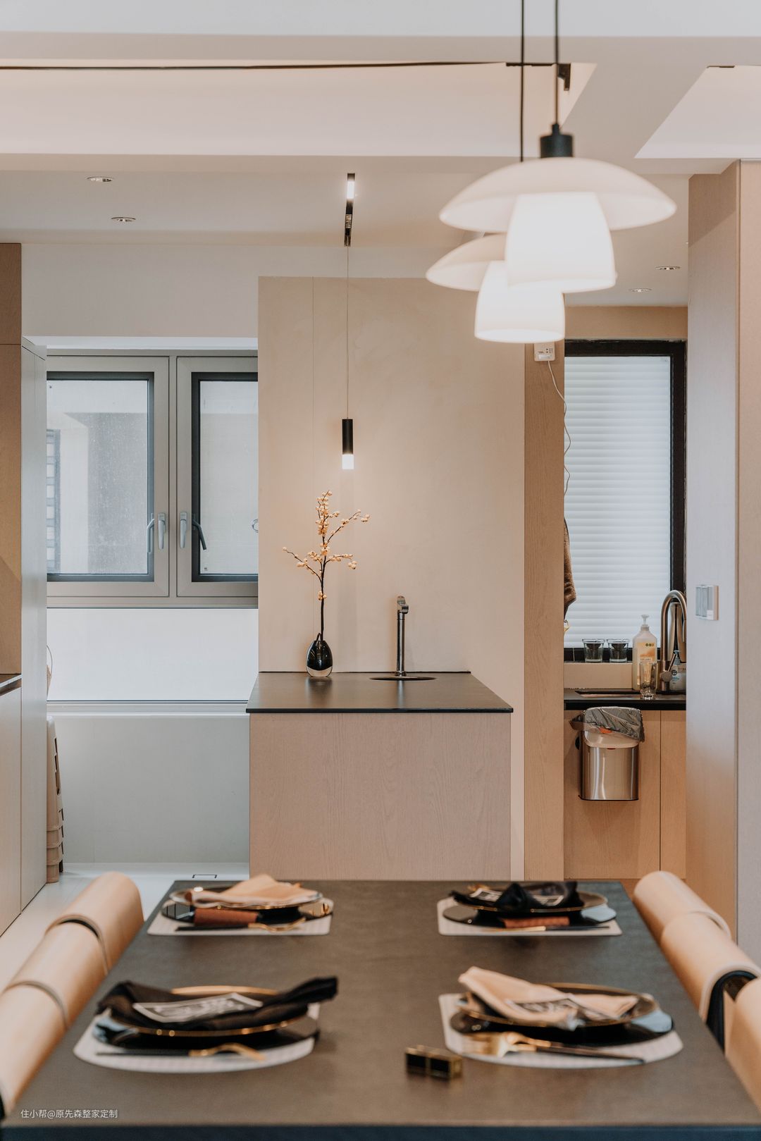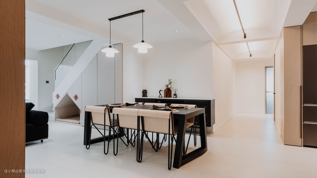餐厅部分,延续了客厅的色调搭配,黑色的餐桌搭配上原木与黑色撞色的餐椅,显得既有高级感又有设计感。餐桌顶上安装两盏吊灯,一方面可以重点打亮餐桌部分,另一方面还可以增添餐厅的氛围感,提高用餐的舒适度,特别业主家只有两口人,会让餐厅变得十分温馨。 靠墙定制了餐边柜,但未像常规一样定制到顶的餐边柜,上方留空的部分可以摆放一些常用物品或者装饰品绿植,实用性强;不到顶的设计从外观看来,也显得更美观,视觉上也不会显得压抑。