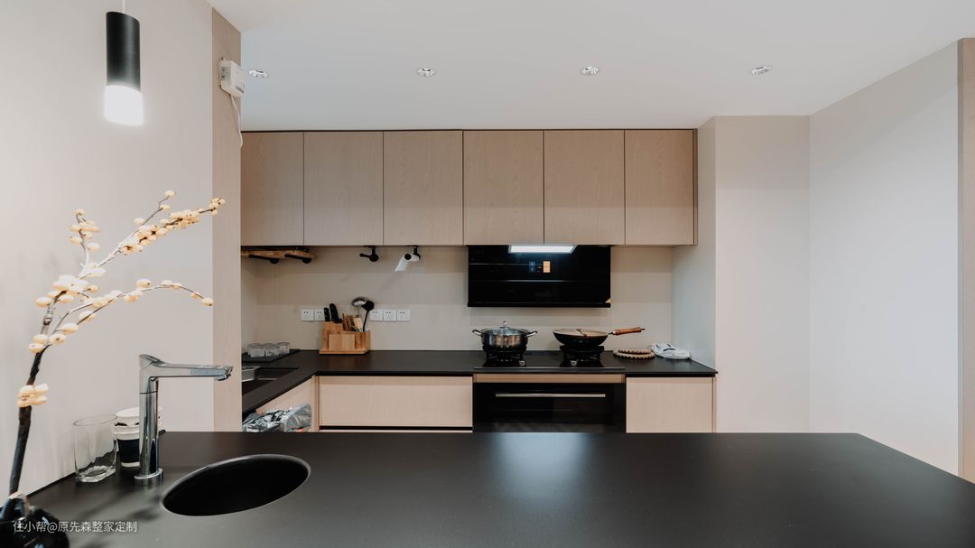 厨房采用了开放式的厨房,属于是中式与西式厨房相结合,中间利用一个岛台作为隔断,使两者的功能分区更清晰,双方的操作区也互不影响,岛台还可以承担部分厨房的备餐压力,可以容纳更多人的在厨房里面操作~ 中式厨房使用L字型的操作台,备餐动线流畅,墙壁上预留的五插座,再也不用担心厨房小家电多的问题;橱柜选用了和餐客厅同种的色调,原木色的柜体搭配上黑色的操作台,使得整家的协调性更强。 冰箱内嵌在了西厨这面的橱柜中,既不多占空间,也显得厨房的整体性更好,且内嵌式的冰箱节能性更好,颜值又高,性价比也棒的设计又有谁会不喜欢呢?