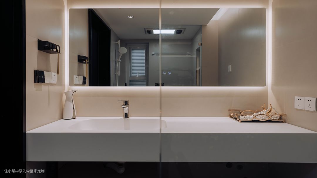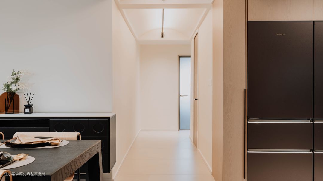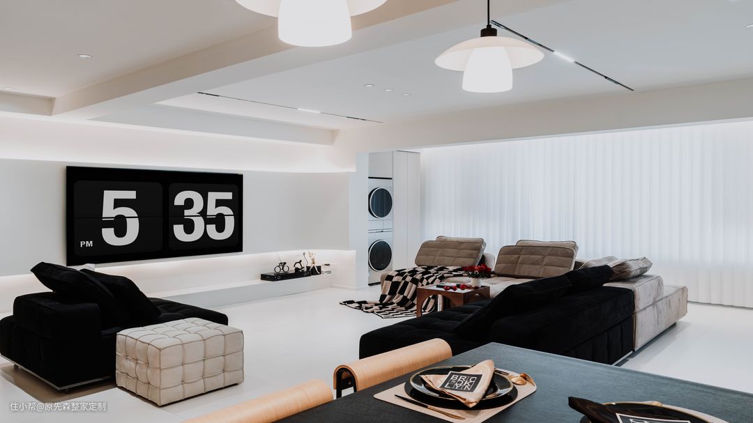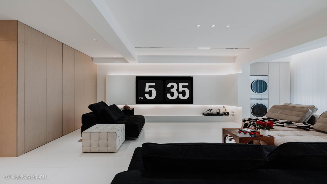 经典黑白灰的色调搭配,色彩鲜明具有强烈的对比性,功能分区明确空间功能性强;简约并不等于简单,而是将多余没有用的东西舍弃掉,更加注重功能性,实用性更强的用品,这样还节约了装修的成本; 电视背景墙采用悬浮墙体设计,电视安装在悬浮墙体上,使得电视背景墙具有超强的空间层次感以及设计感,墙体后嵌隐藏式的灯带;晚上时分,将其他灯关掉,客厅就是一个温馨的“影院”,提供一个舒适的观影环境。 墙体定制了原木色的护墙板,给空间增添了几分温柔,住起来也会更舒适;护墙板还可以起到保护墙体的作用,相比于乳胶漆或者墙纸来说,护墙板更加耐用,使用年限长,也更加环保;还可以起到部分隔音效果,居住体验感更好~ 吊顶采用的是当下主流的两边吊顶,两边吊顶的好处便是不压层高,避免了灰尘的堆积,减少清洁降低家务压力;边吊安装射灯,可以辅助照明,天花板安装了轨道灯以及暗装筒灯,筒灯打亮了下方的茶几,轨道灯可以使客厅的光源更加均匀,保护眼睛。