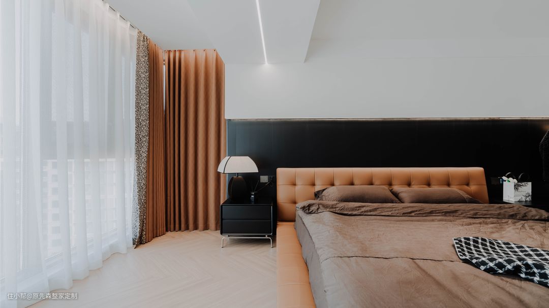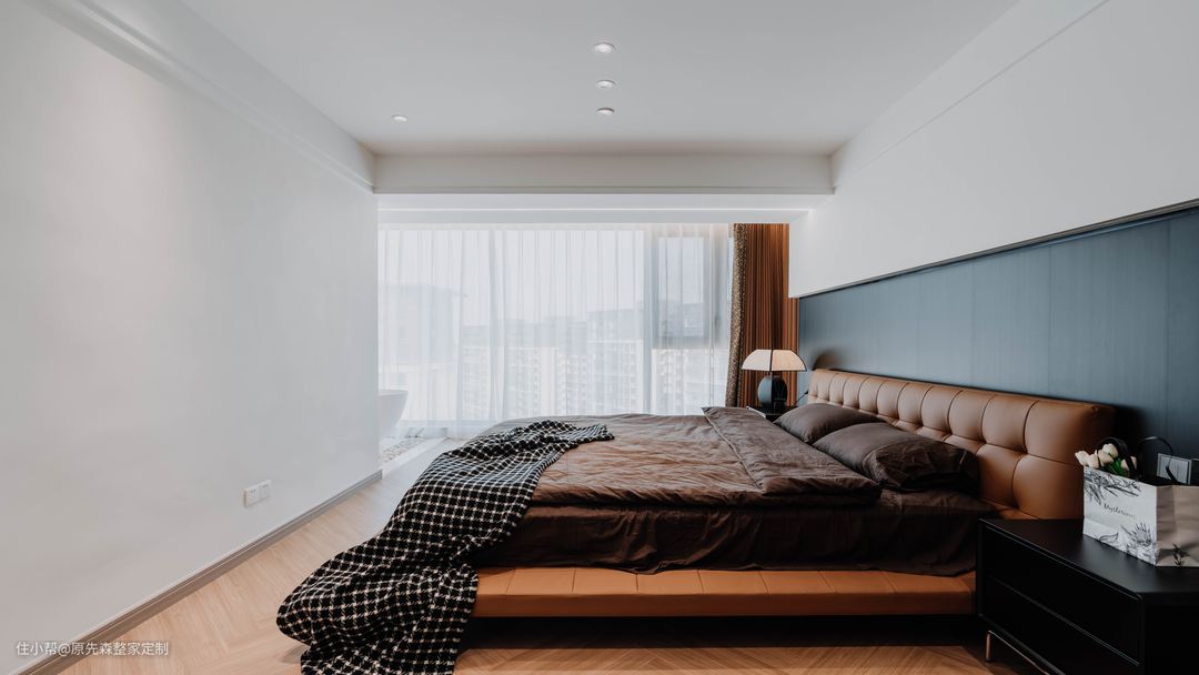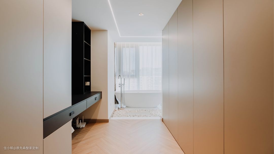 主卧一整面的落地窗,使得主卧的视野十分开阔,地台床相比于传统的床而言,收纳空间会更好,在地台的内部拥有一个储物空间;地台床的使用也更加灵活,地台部分可以当做沙发使用,看起来也更加美观,可以与室内的装修很好地搭配,使得装修效果更好; 主卧的色调搭配与整家相同,黑色搭配上浅咖色,不仅不会使主卧显得压抑,还会使主卧高级感满满;主卧的旁边是一个小次卧,但是设计师巧妙地将其改造成为了衣帽间,采用了衣柜+梳妆台的设计,梳妆台也可以作为书桌使用,衣帽间也多了“书房”的作用,真正地做到了“一房顶多房”。 在阳台部分,安置了一个浴缸,无需担心隐私问题,安装的防偷窥玻璃便可以轻松解决这个难题;晚上时分,在浴缸中悠闲地泡着澡,然后观赏着窗外的美景,该是一件多么惬意的事情~