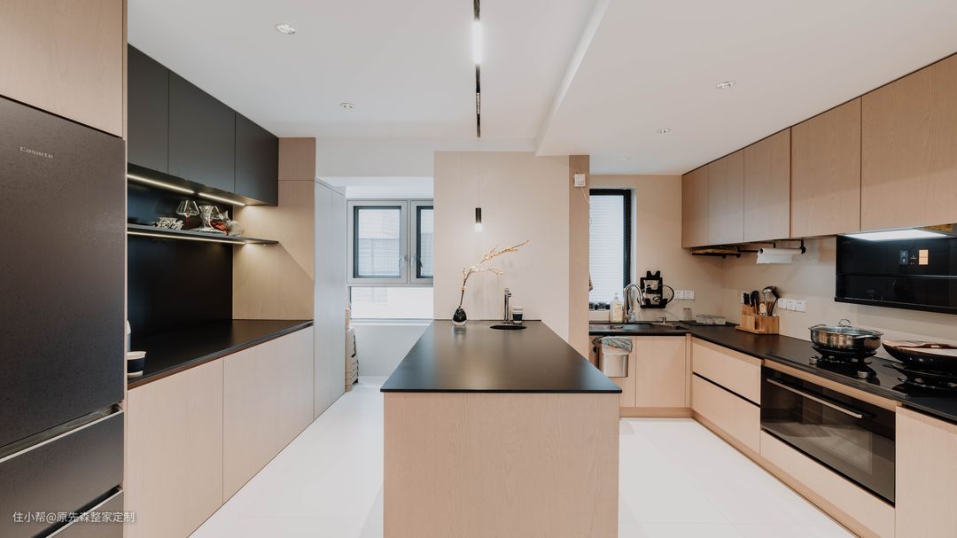 厨房采用了开放式的厨房,属于是中式与西式厨房相结合,中间利用一个岛台作为隔断,使两者的功能分区更清晰,双方的操作区也互不影响,岛台还可以承担部分厨房的备餐压力,可以容纳更多人的在厨房里面操作~ 中式厨房使用L字型的操作台,备餐动线流畅,墙壁上预留的五插座,再也不用担心厨房小家电多的问题;橱柜选用了和餐客厅同种的色调,原木色的柜体搭配上黑色的操作台,使得整家的协调性更强。 冰箱内嵌在了西厨这面的橱柜中,既不多占空间,也显得厨房的整体性更好,且内嵌式的冰箱节能性更好,颜值又高,性价比也棒的设计又有谁会不喜欢呢?