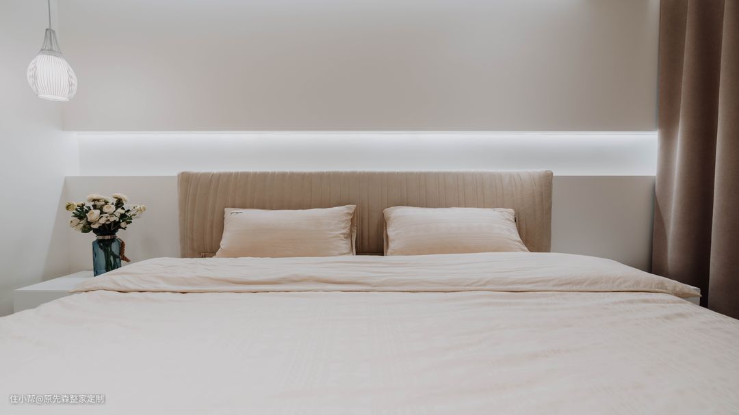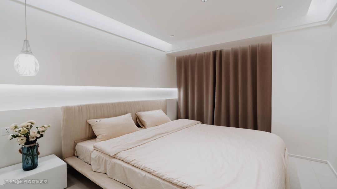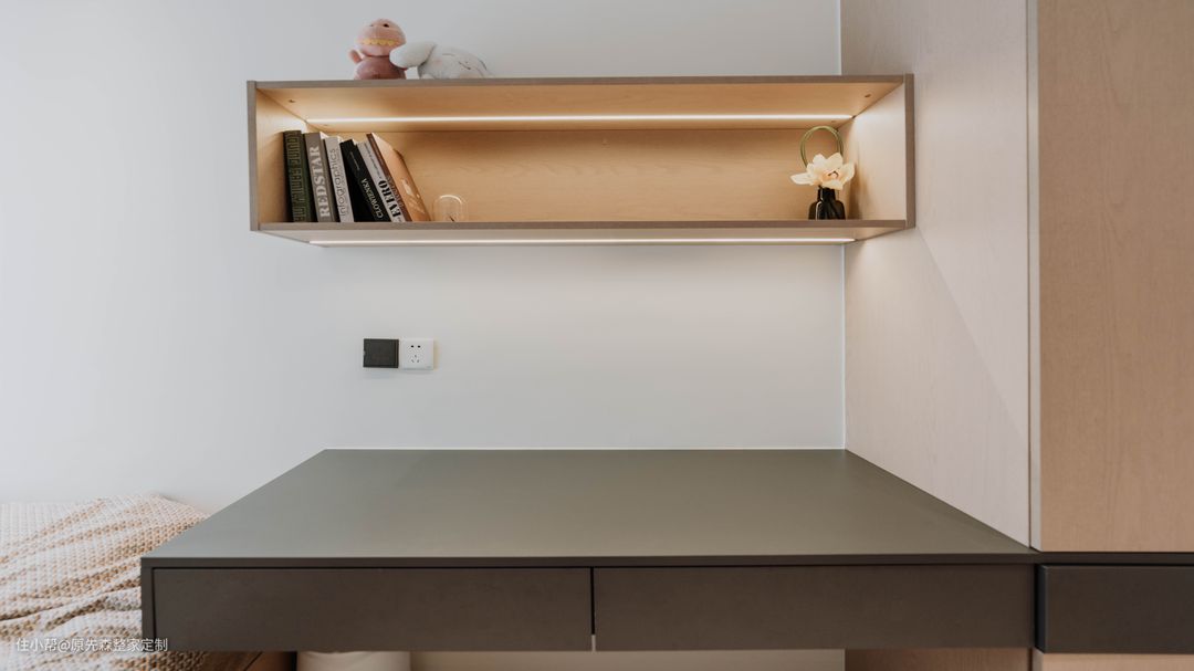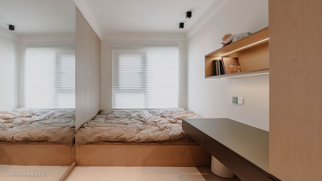 次卧的设计相对就简单了一点,同样的地台床,搭配上一盏吊灯,面积虽小却十分温馨,营造出了一个舒适的睡眠环境;另外一个小次卧设计师改造成为了一个书房,靠窗定制了榻榻米,床位定制了到顶的衣柜,收纳能力满满~ 床头的悬空书桌,还可以充当床头柜使用,悬空的设计不仅设计感强,还便于打扫;上方安装了一个壁挂的书架,线型灯带的安装就算晚上关上灯,也可以舒心地看书,还可以很好地保护眼睛。