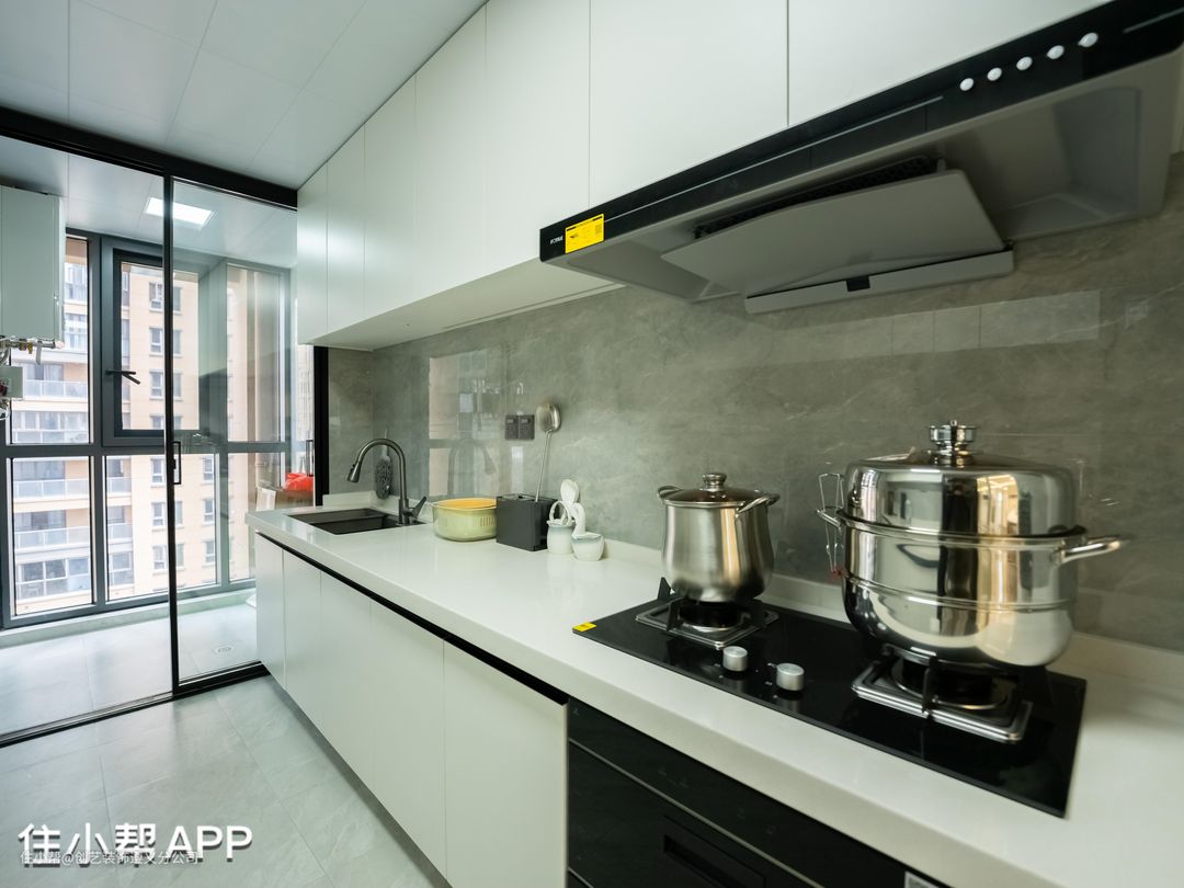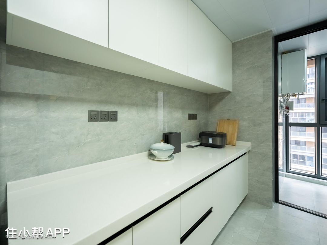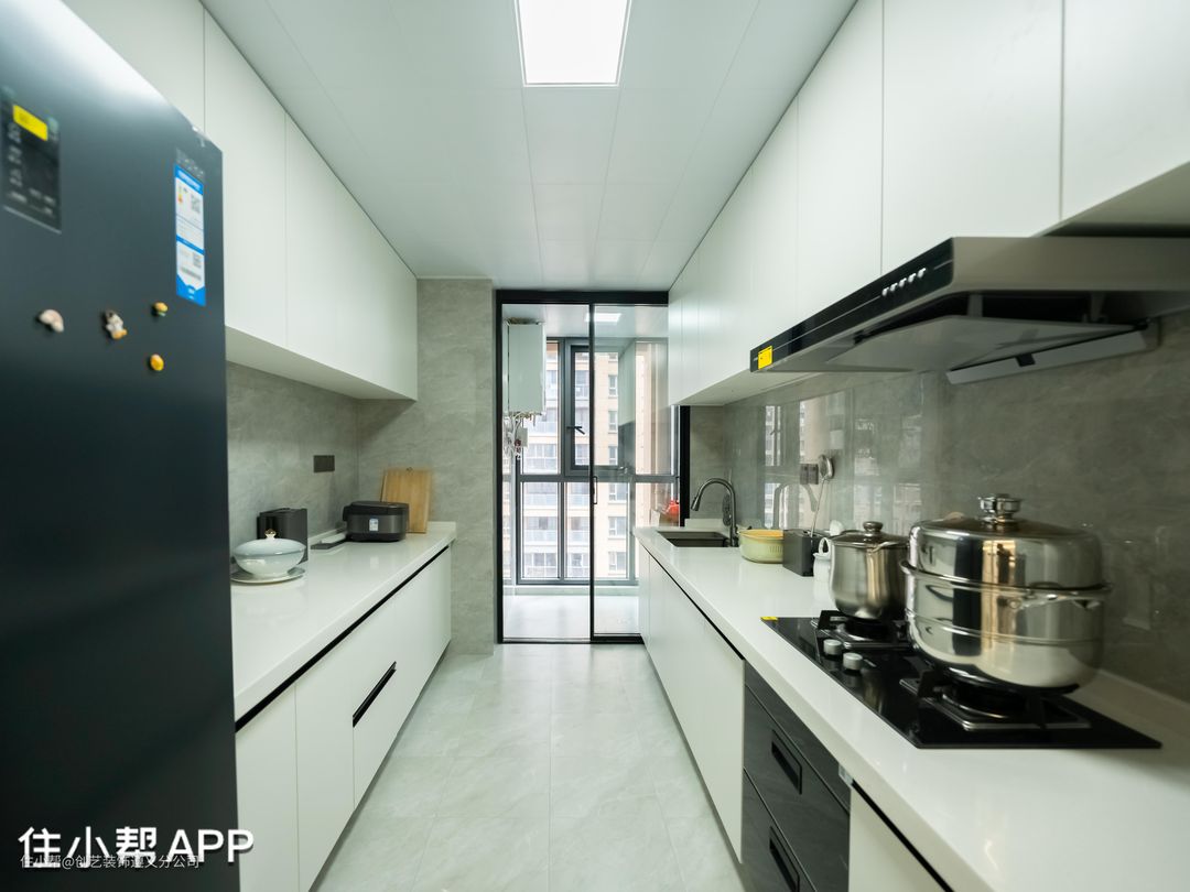 ▲橱柜 ▫️ 厨房H型布局,烹饪区和储物区分明,两面定制打橱柜,功能齐全却依旧“空无一物” √ ▫️ 地面通铺哑光大理石瓷砖,搭配纯白色无把手橱柜,显大又亮堂,收纳尽可能上墙,干净又整洁 √ ▫️ 吊柜和地柜,再加上置物架、调料罐架、碗碟架等上墙收纳神器,中间地柜内部的做拉篮设计,将每一寸空间充分利用,台面整洁干净,收纳实力爆棚!💯