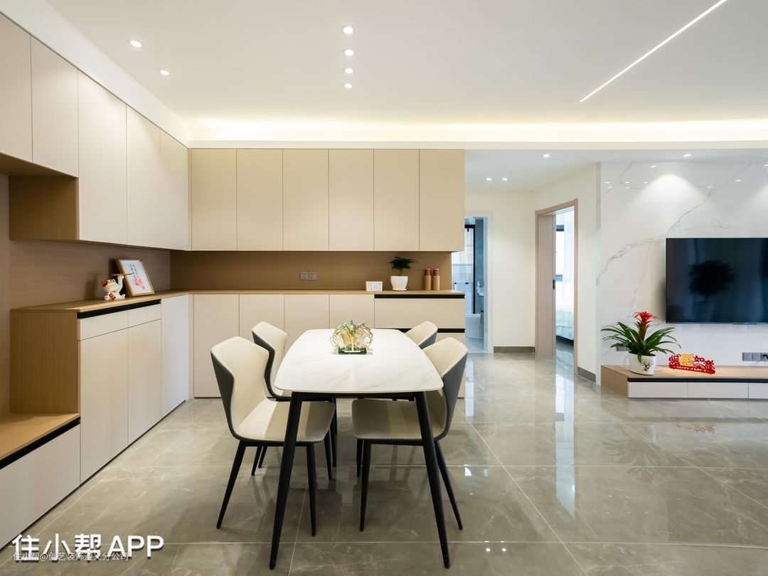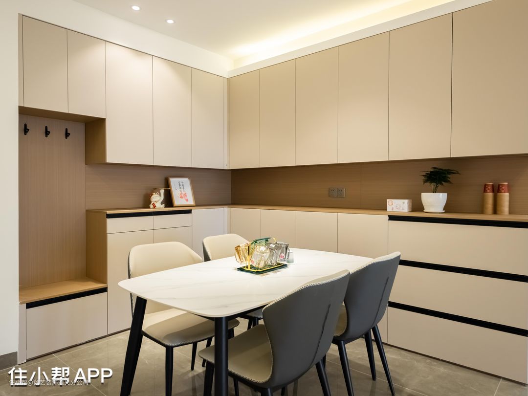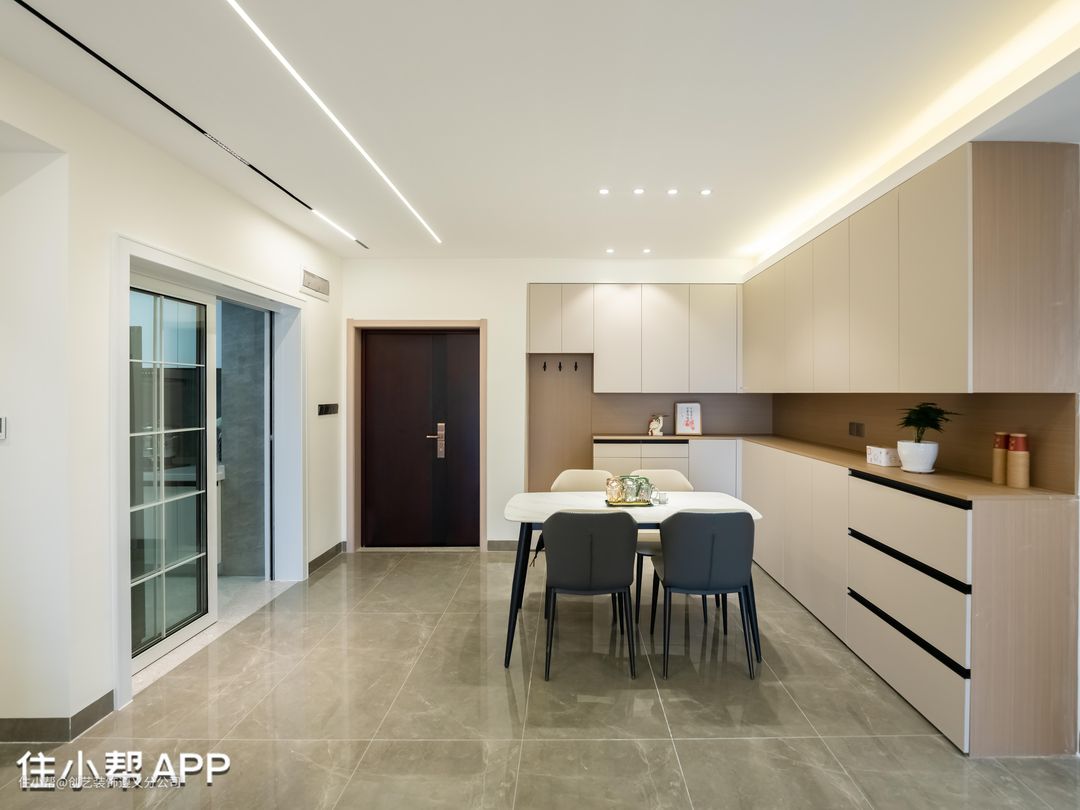 ▲餐边柜 ▫️ 顶天立地的餐边柜长约1.2m,解救餐桌收纳 √ ▫️ 上方做收纳柜,中间置物区可以放小物件 √ ▫️ 地柜用来收纳家居用品,柜门做铣槽拉手设计 √