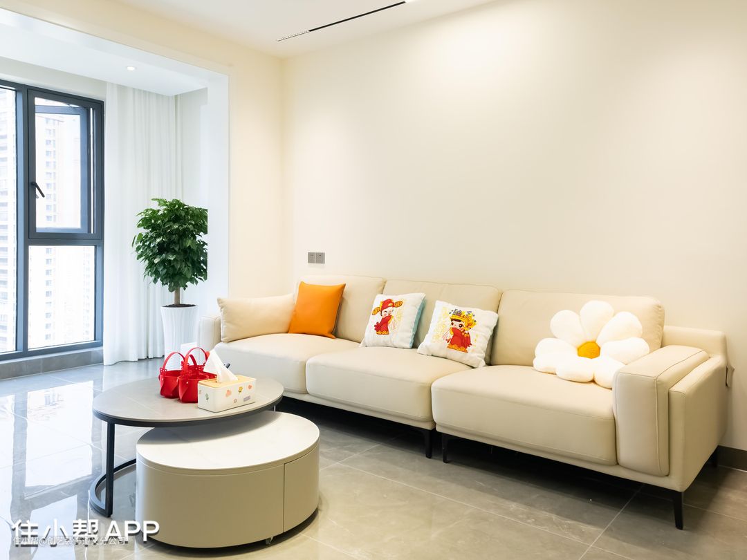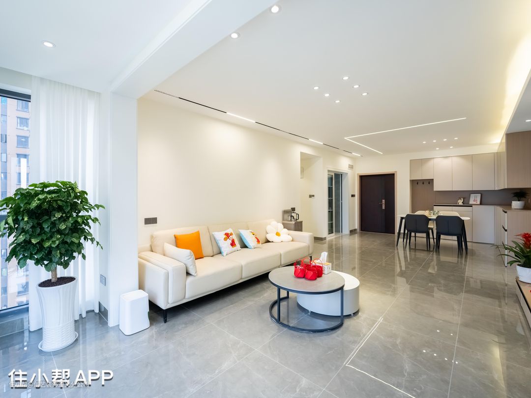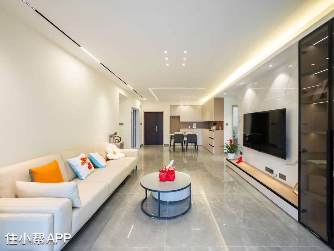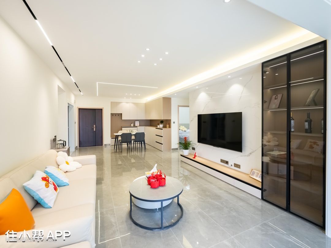 ▲电视背景墙 ▫️ 电视墙运用简洁硬朗的纹理背景搭配展示柜,高清玻璃柜搭配灯带,把装饰物的高级感展现得淋漓尽致,一虚一实尽显主人的品味 √ ▲沙发背景墙 ▫️ 沙发背景墙简约大方,留白让光阴赋予它无限想象,无主灯增加层次氛围感,让人随心所欲,自由热情的生活 √ ▫️ 搭配一张米白色沙发+灰白拼接茶几,一盆简约绿植,太舒服啦√