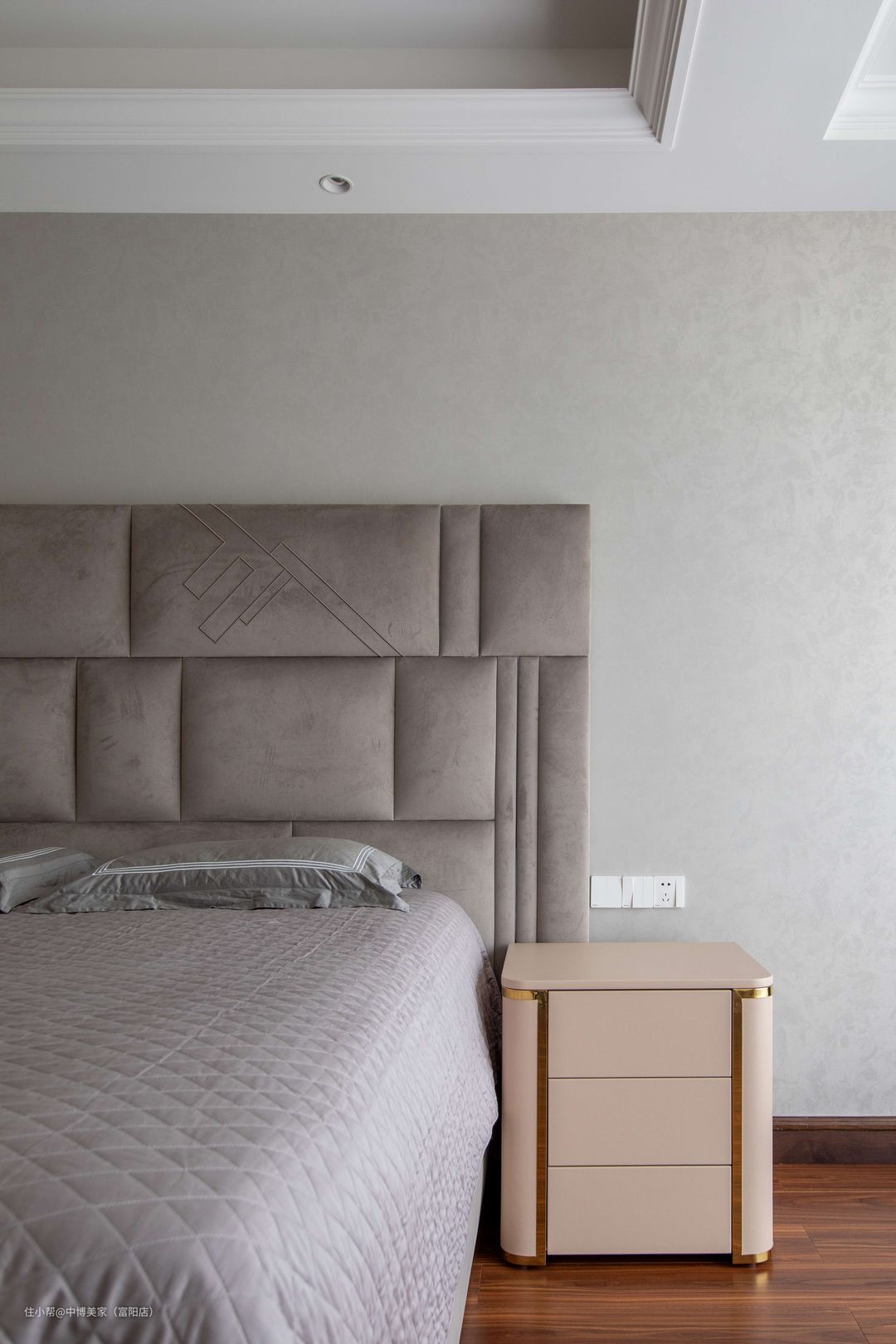主卧选用木制地面做设计,温馨又舒适感十足,双眼皮吊顶搭配白色石膏线条,中间的水晶吊顶加持着,美观又明亮。