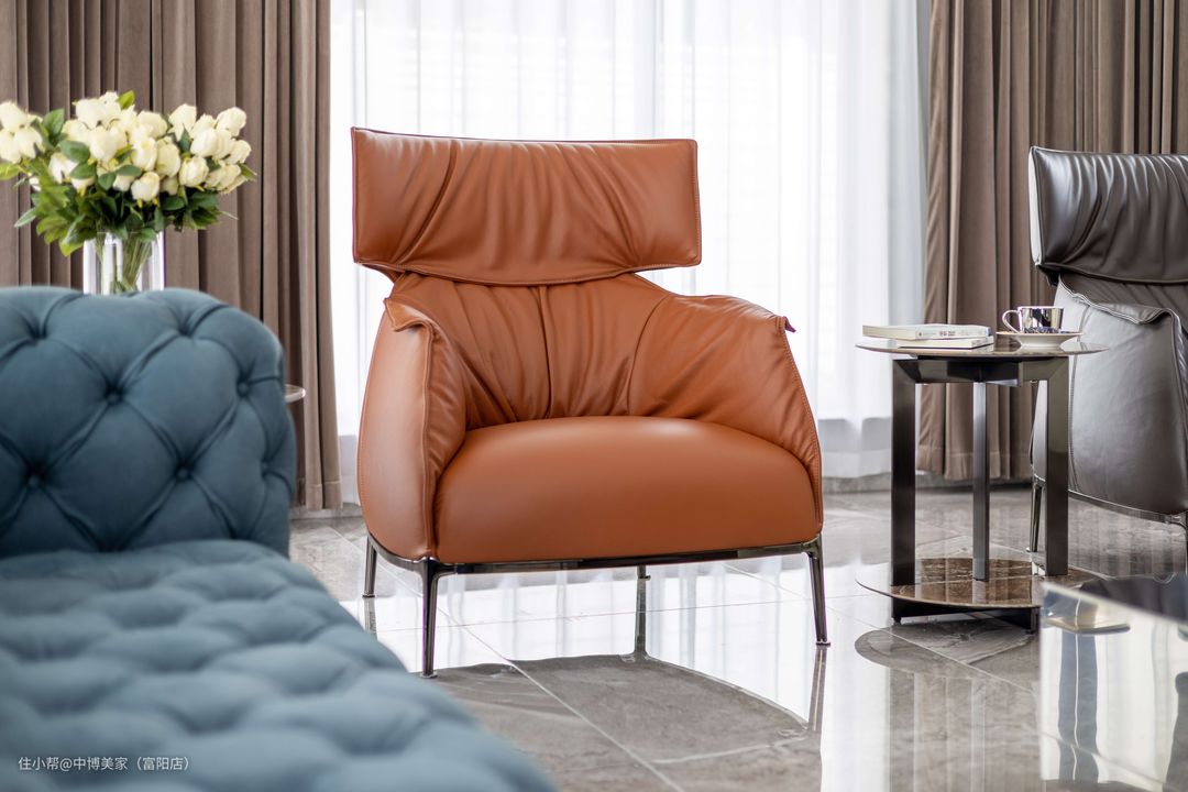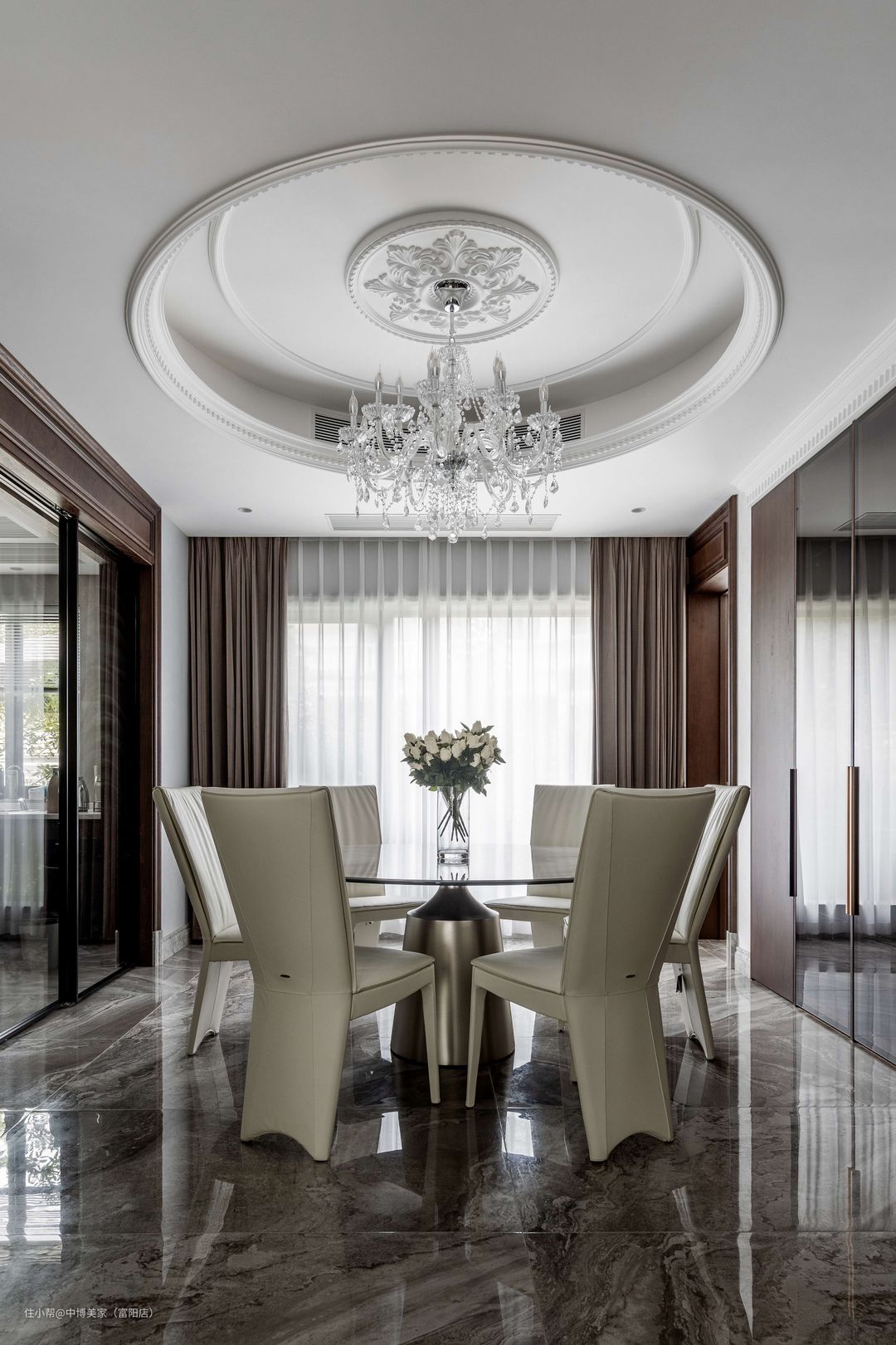 圆形的大理石餐桌配上白色皮质餐椅,清新脱俗;桌上的玻璃杯与鲜花的点缀,将空间氛围感瞬间提升,为主人打造温馨的用餐氛围。