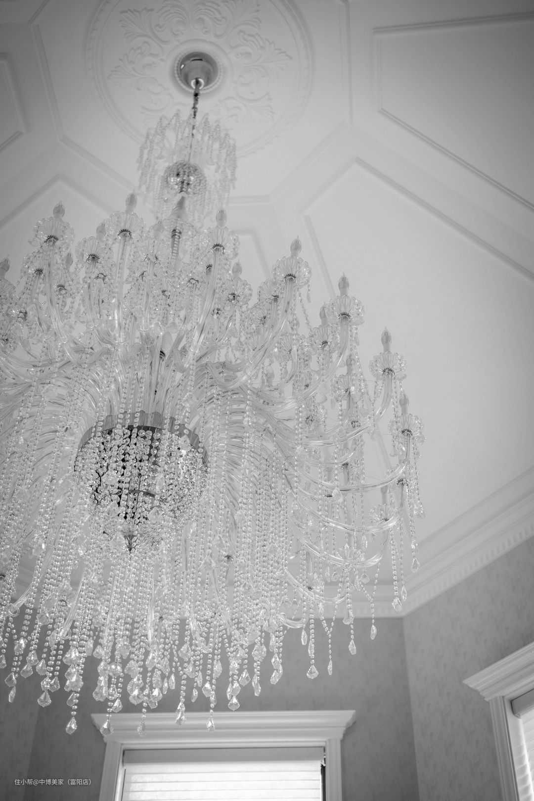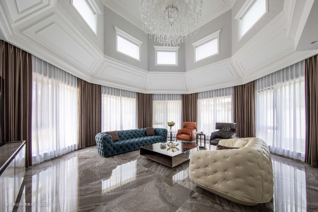 四周石膏线条打造的造型,多个对称式的窗户不仅让采光效果更加,也极具美观性;中间的白色水晶吊灯奢华十足。