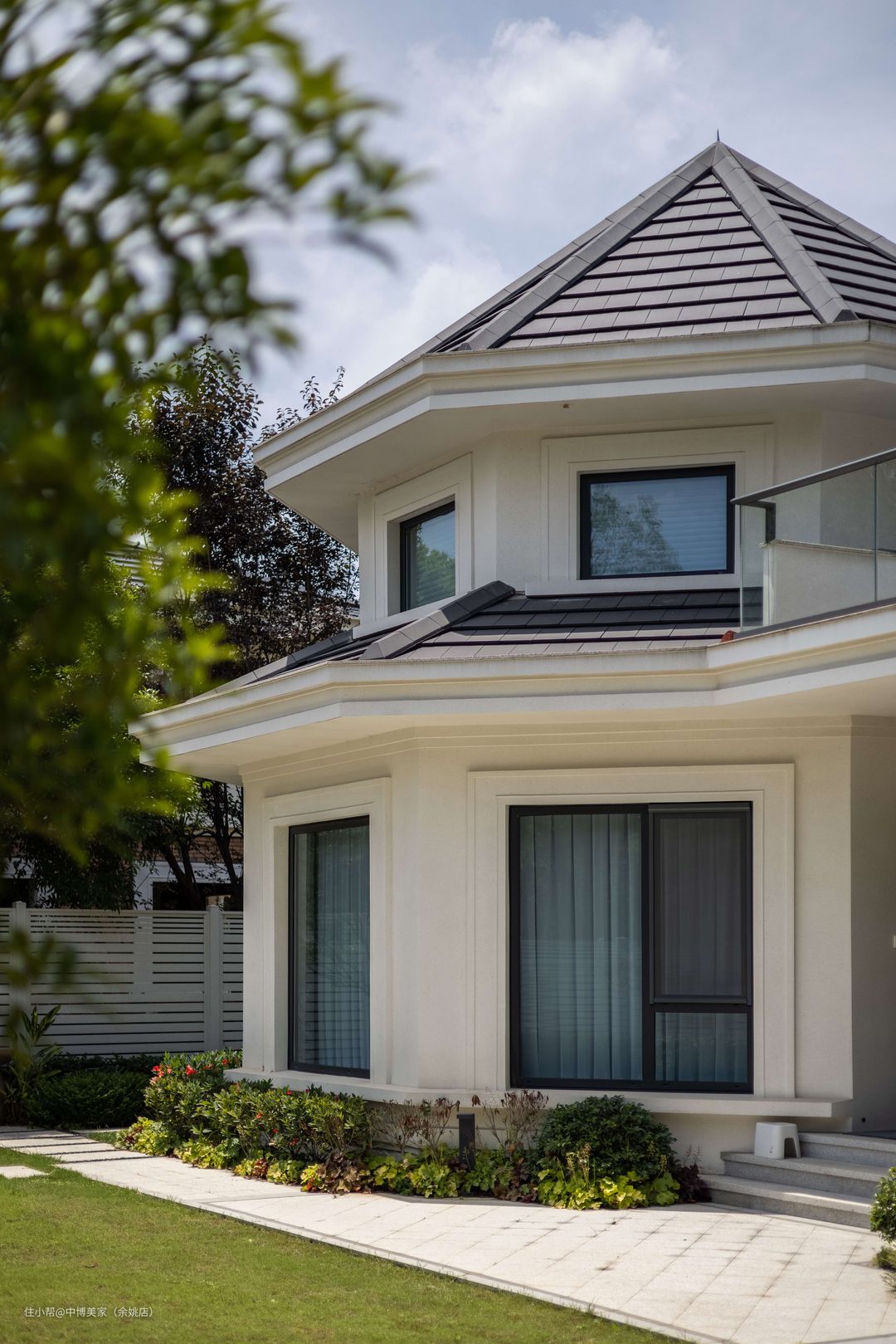 庭院中间摆放着一整套白色的铁艺桌椅,休闲之际在这里与亲友喝喝茶、聊聊天,十分惬意。