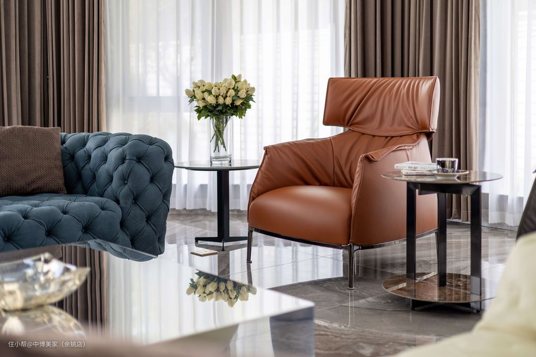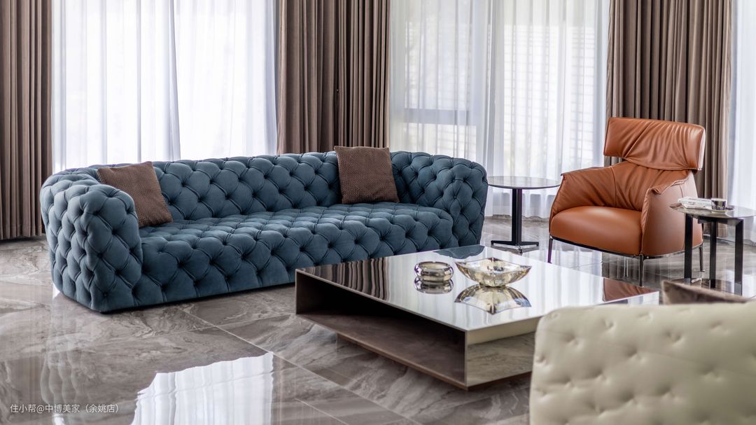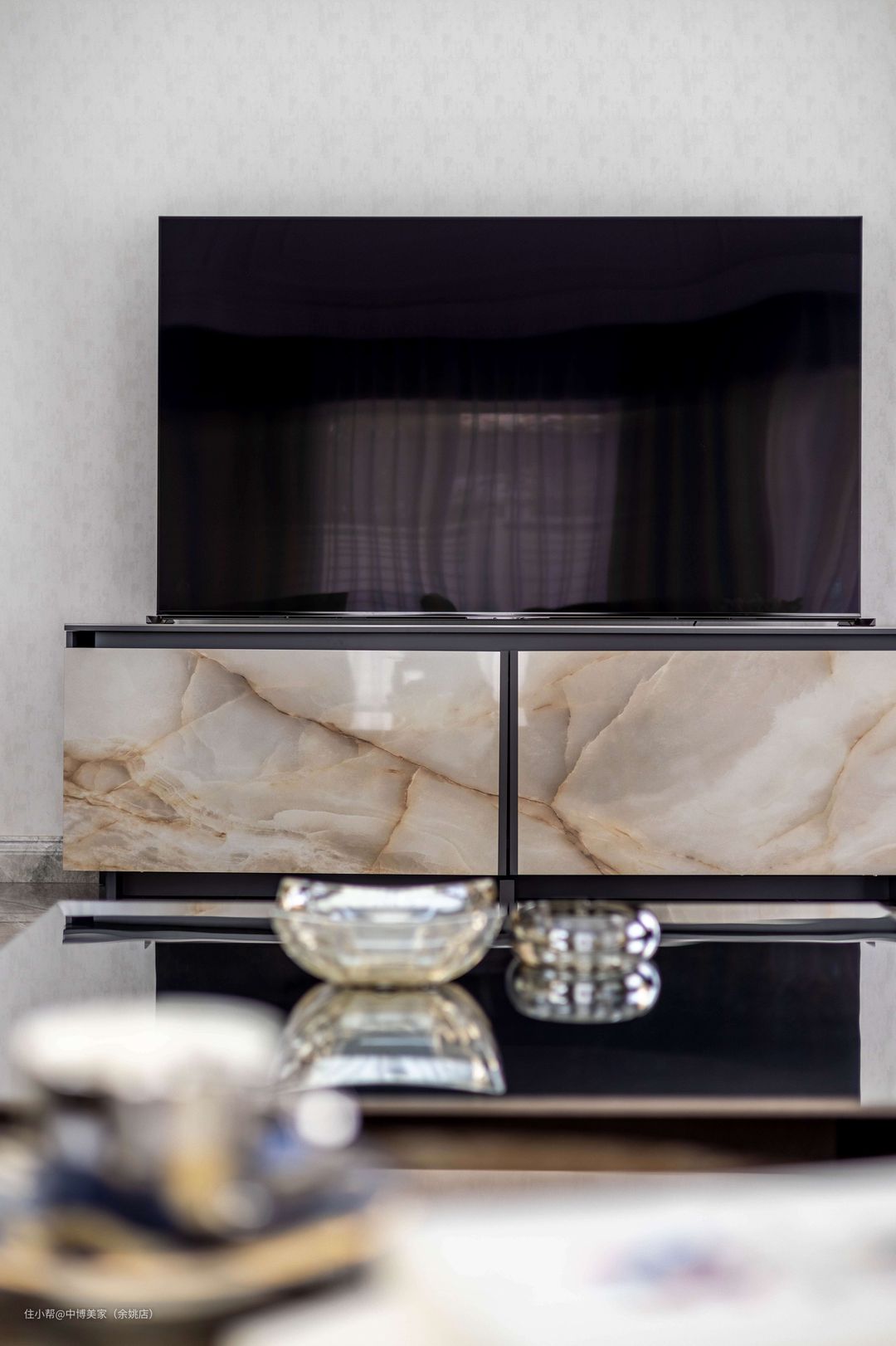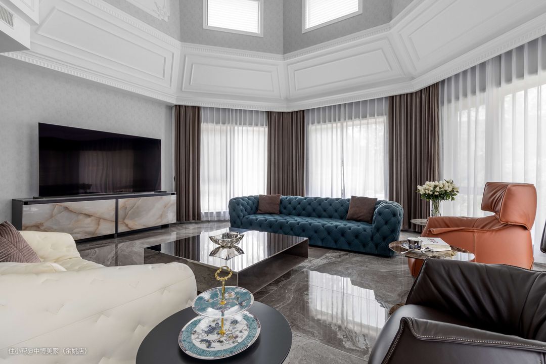 灰白色的电视背景墙与整体设计一致,大理石电视柜不仅轻松收纳物件,配色设计方面也十分有美感。