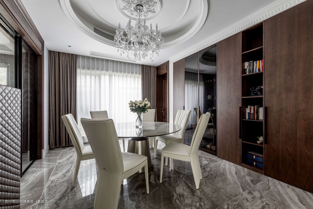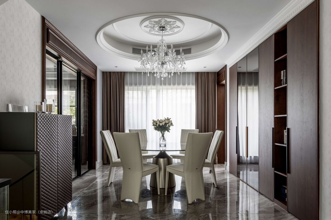餐厅吊顶是方形与圆形相结合的造型,方中有圆,交错相容,与奢华典雅的水晶吊顶相辅而成,相得益彰,显得大气十足。