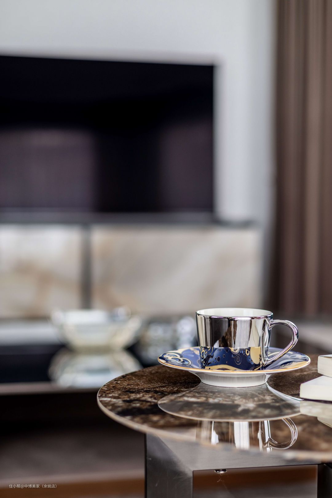 灰白色的电视背景墙与整体设计一致,大理石电视柜不仅轻松收纳物件,配色设计方面也十分有美感。