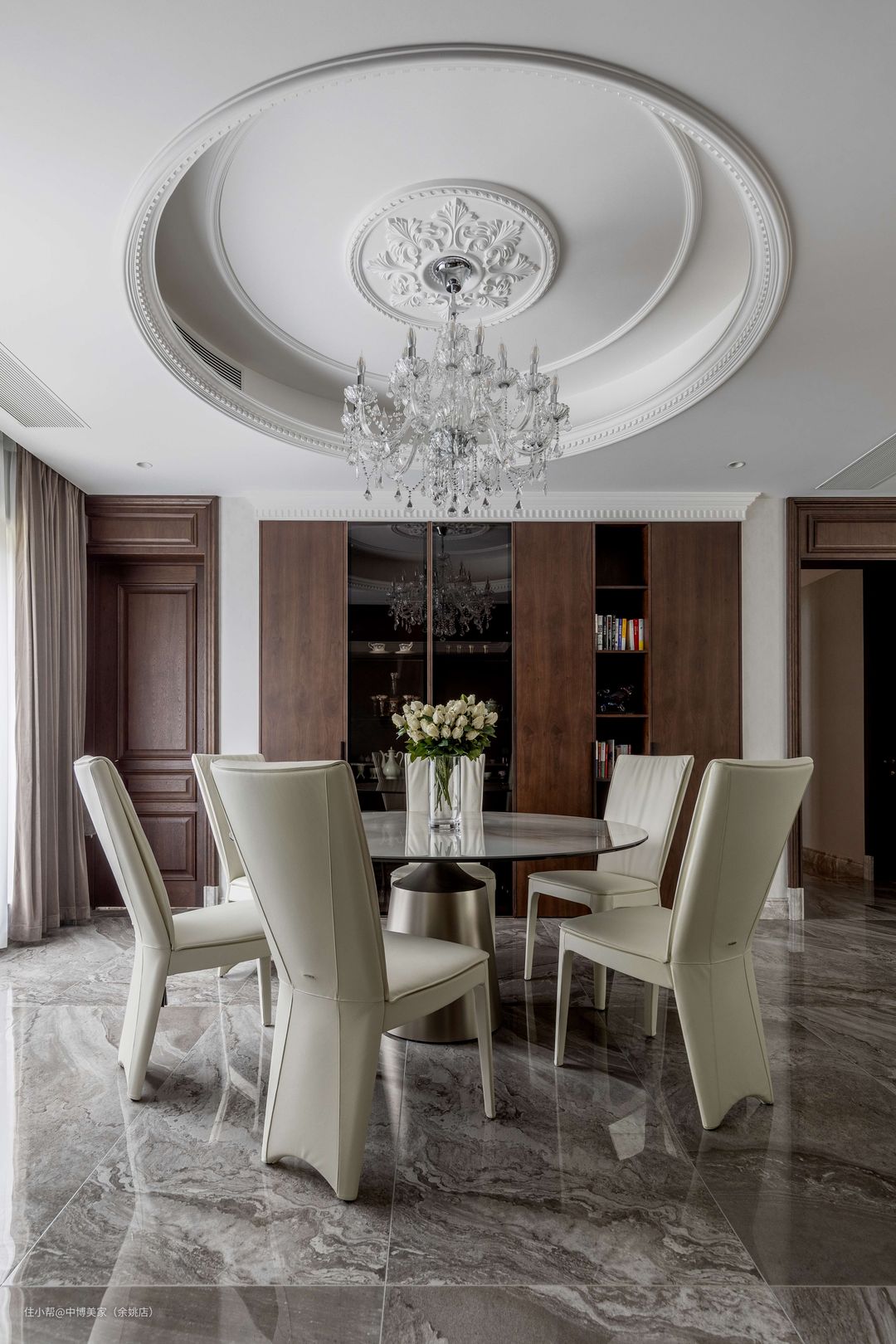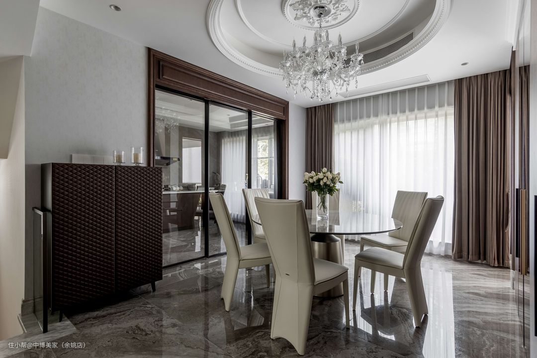 餐厅吊顶是方形与圆形相结合的造型,方中有圆,交错相容,与奢华典雅的水晶吊顶相辅而成,相得益彰,显得大气十足。