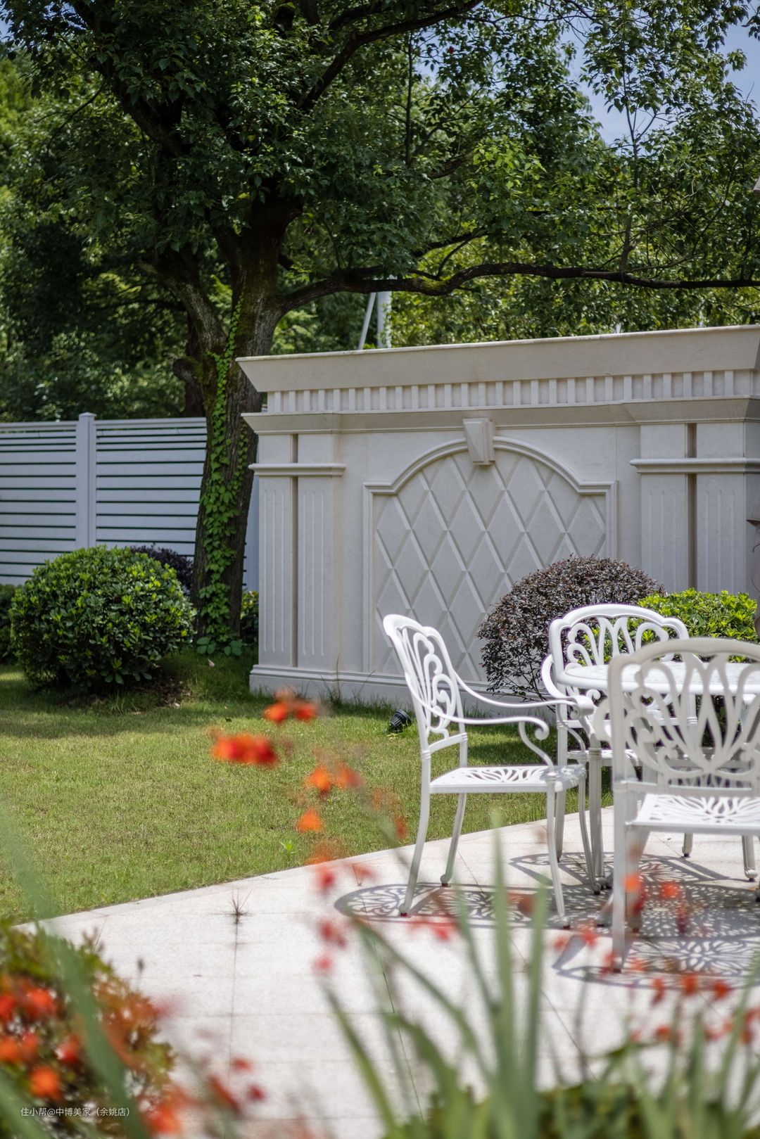 庭院中间摆放着一整套白色的铁艺桌椅,休闲之际在这里与亲友喝喝茶、聊聊天,十分惬意。