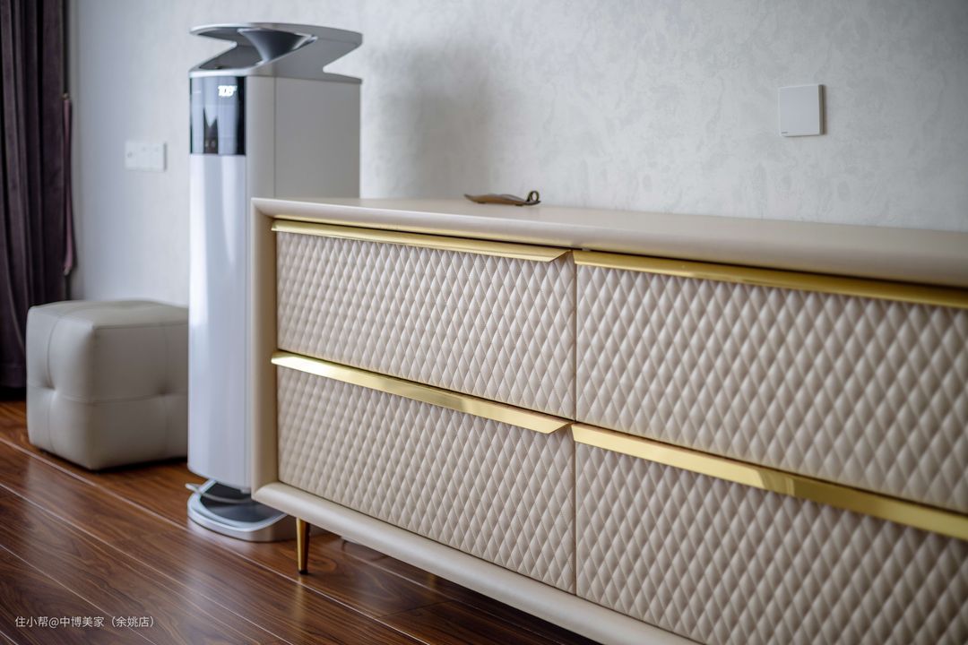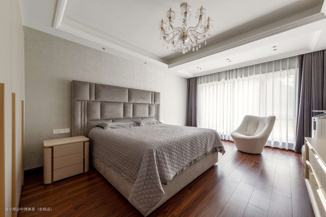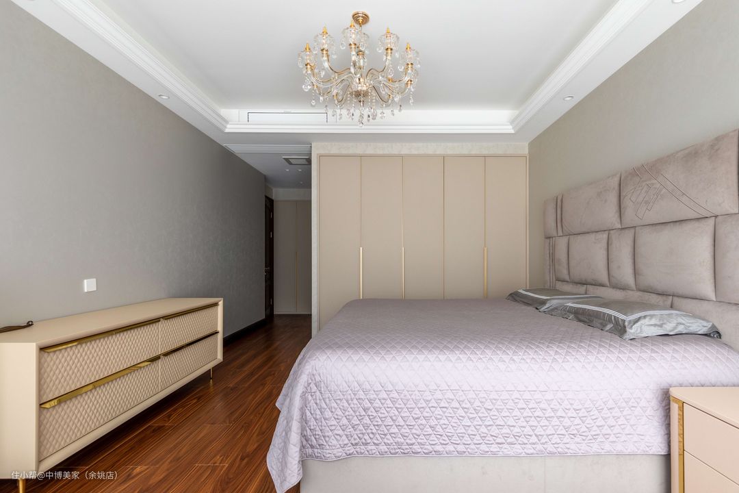 主卧选用木制地面做设计,温馨又舒适感十足,双眼皮吊顶搭配白色石膏线条,中间的水晶吊顶加持着,美观又明亮。
