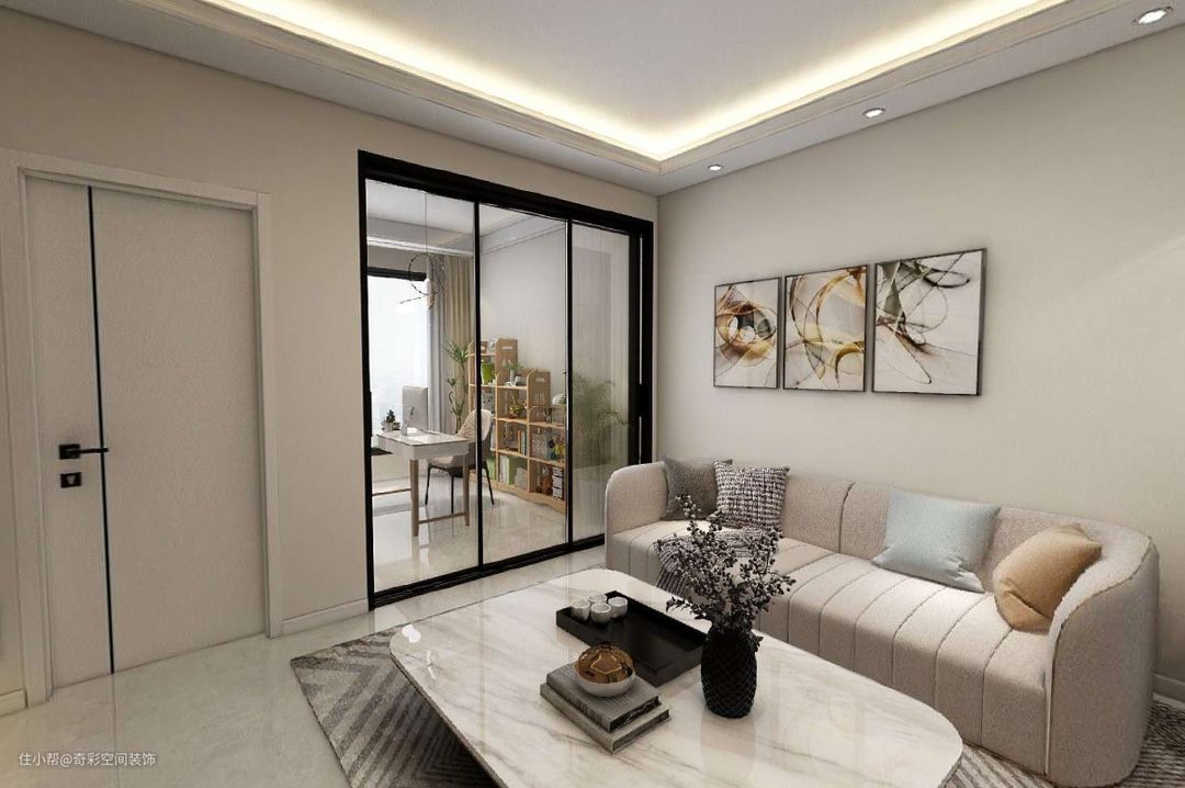 客厅做的双眼皮吊顶,吊顶上加线性灯条,让客厅的整体风格看起来更温馨