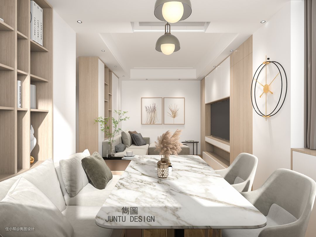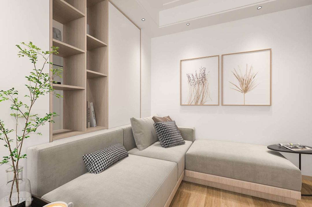 因为本案空间不大,所以整体设计都采用了白色墙体和白色搭木纹的定制组合