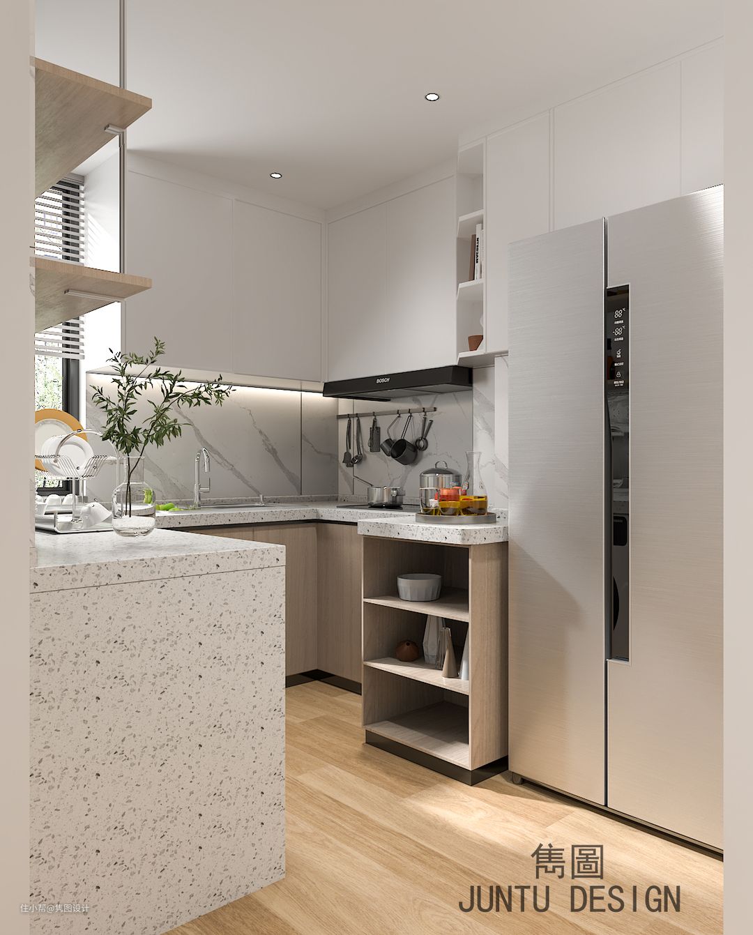 功能齐全的新厨房,有洗衣机和洗碗机,拆除了原来的吊柜增加了采光。
