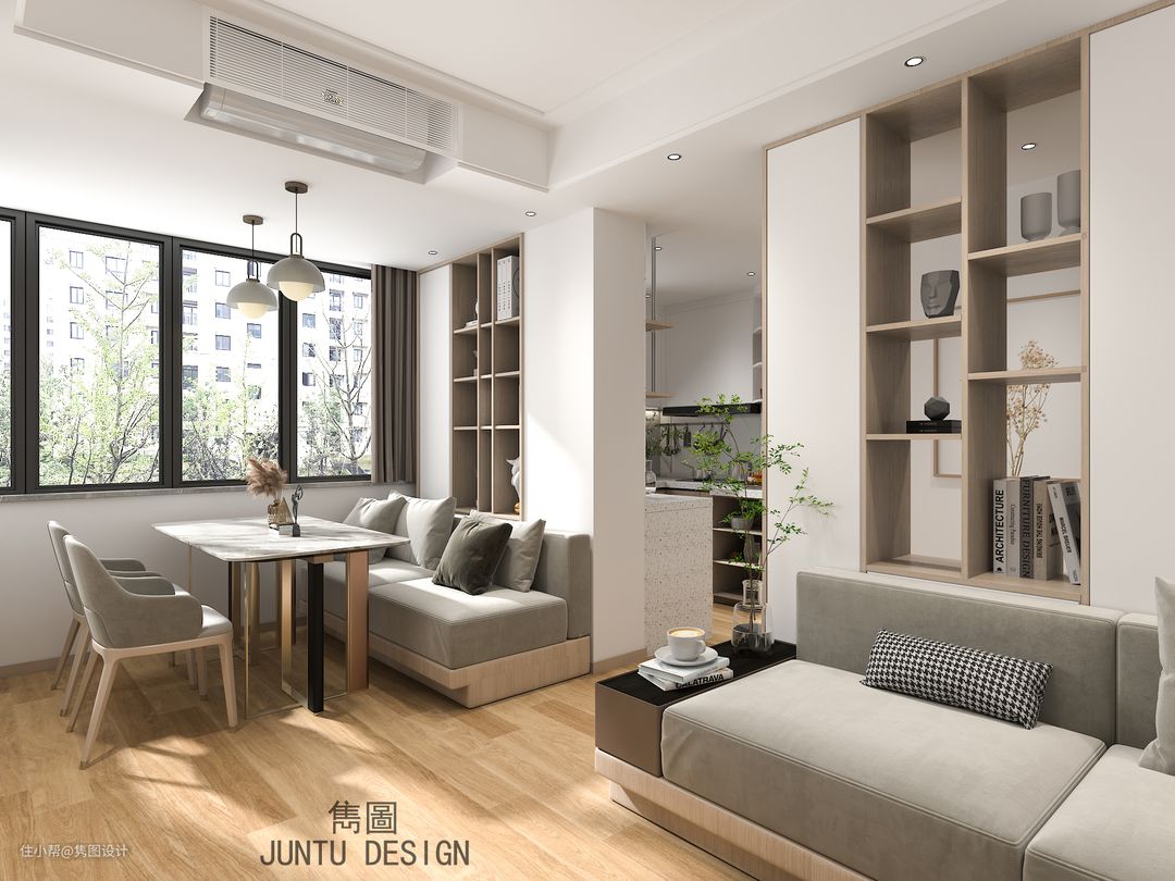 这个13平米的空间我们最大的增加了收纳空间,卡座后面的是餐边柜收纳柜,靠枕后面都带收纳功能,沙发背后强大的鞋柜收纳柜,放了65寸电视的也是电视柜收纳柜,右侧窗边也做了地柜收纳,把收纳做到了极致。