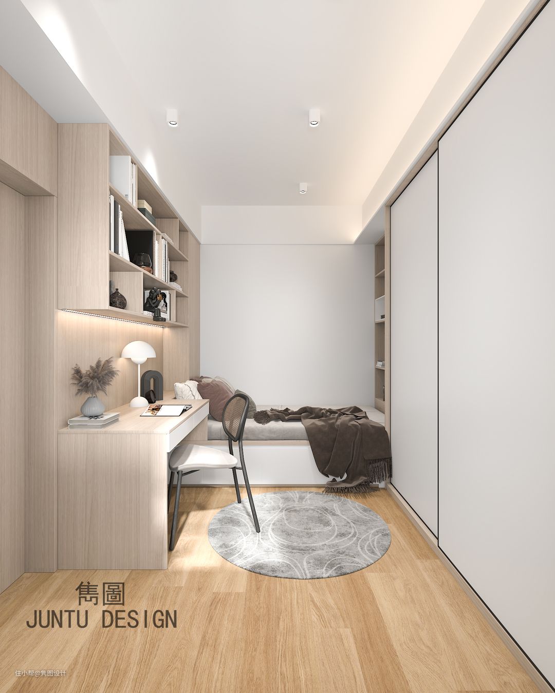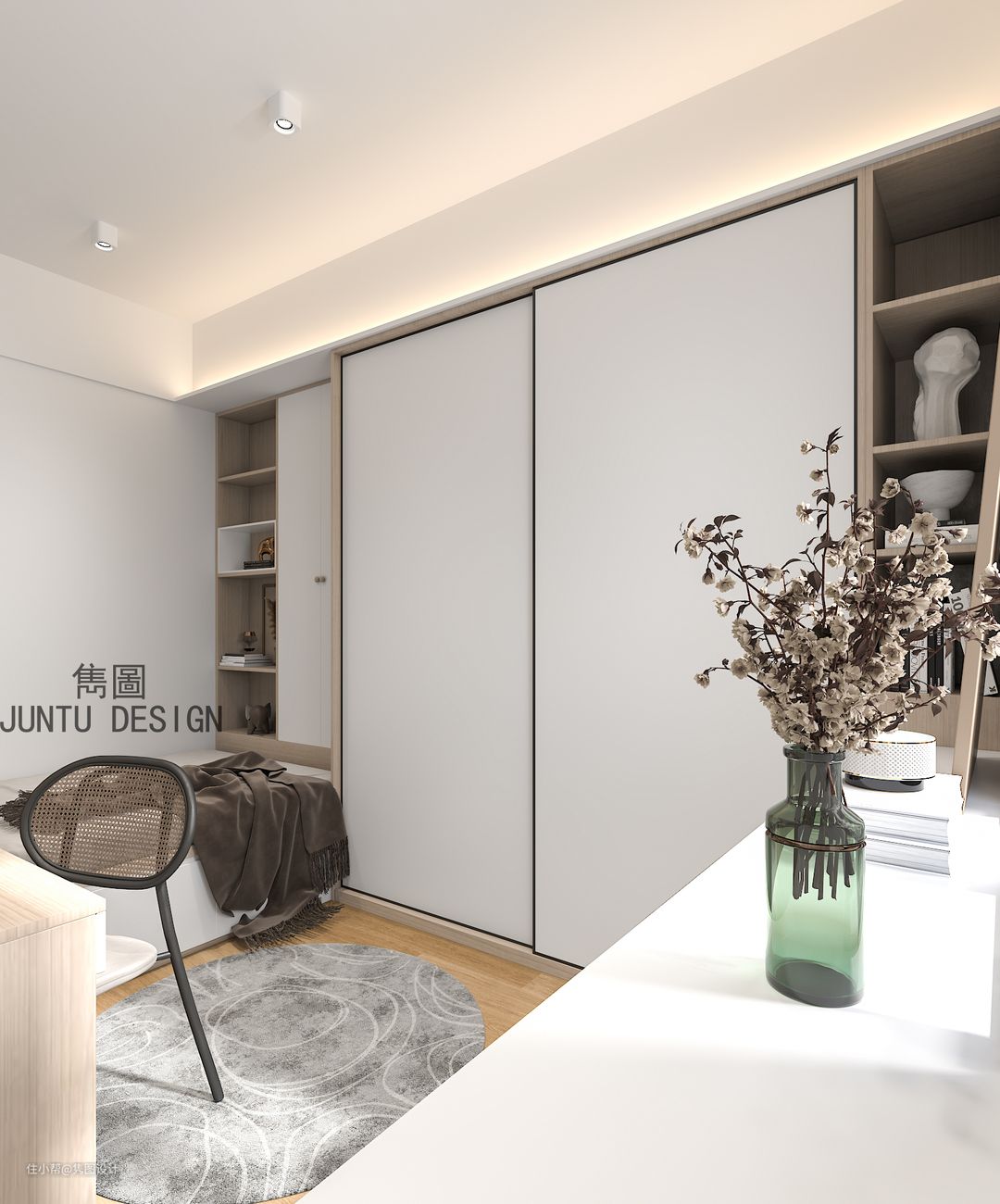 只有一个卧室,也在不影响空间感的情况下做到了收纳最大化,以后孙子可能在附近读书,说不定还要上来,先准备好书架和展示!!