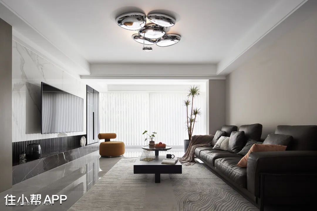 全屋以黑白灰为主基调,客厅与阳台打通,隐形门与不规则形软装的融合,打破常规设计,缔造氛围感家居环境。