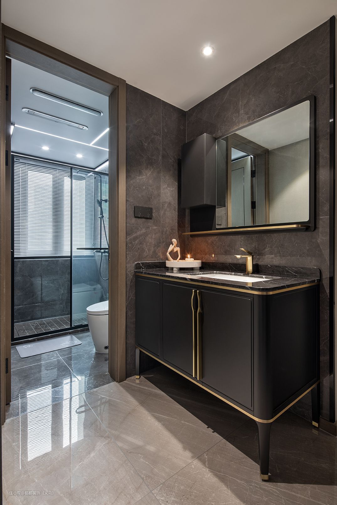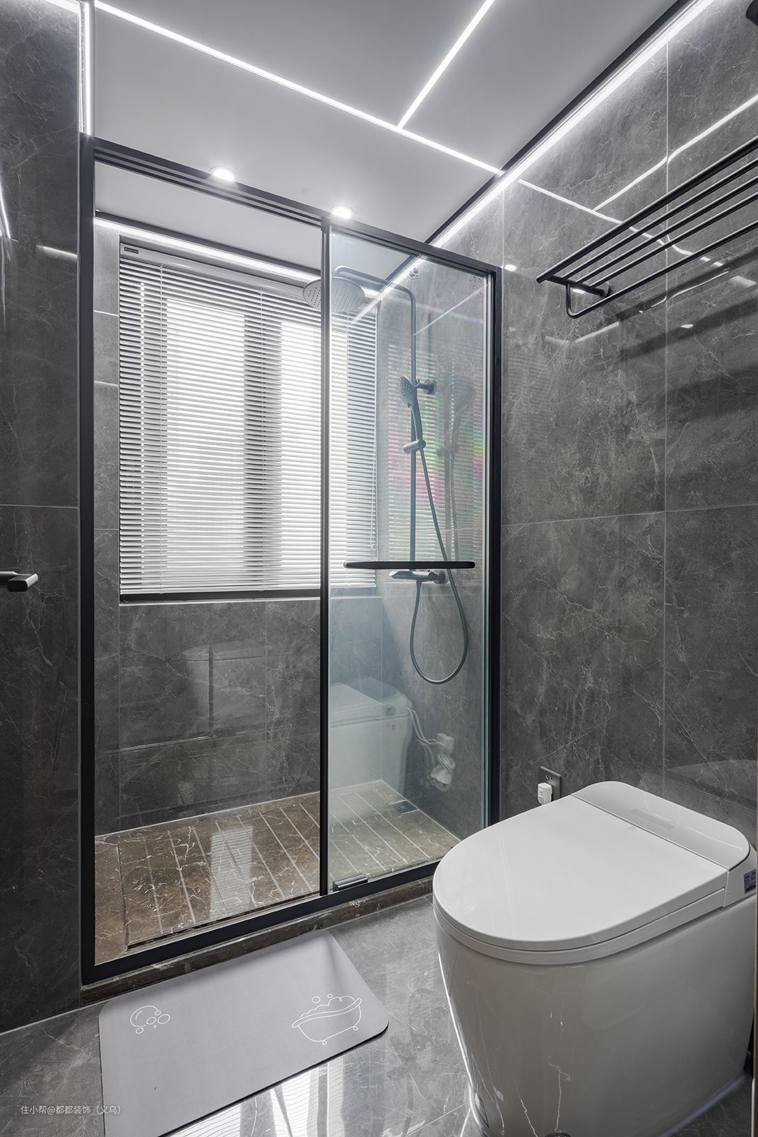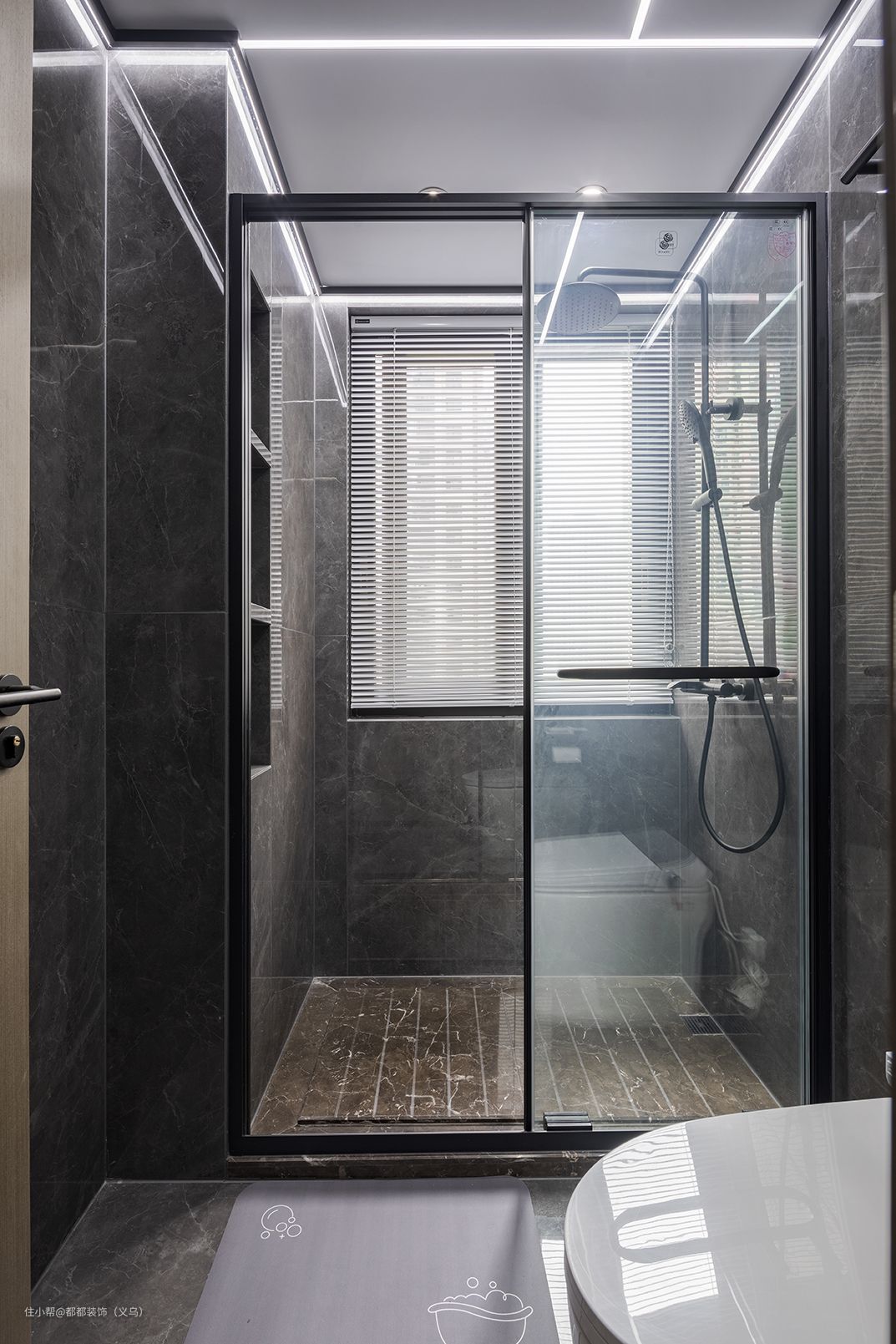 整体采用灰色系,凝练的线条搭配沉稳的色调,轻松打造高级敞亮的浴享空间;淋浴区的百叶窗制造出的光之艺术,在晨起与黄昏,细密的光影链接起空间的内部与外部,为沐浴时光注入更多美好。