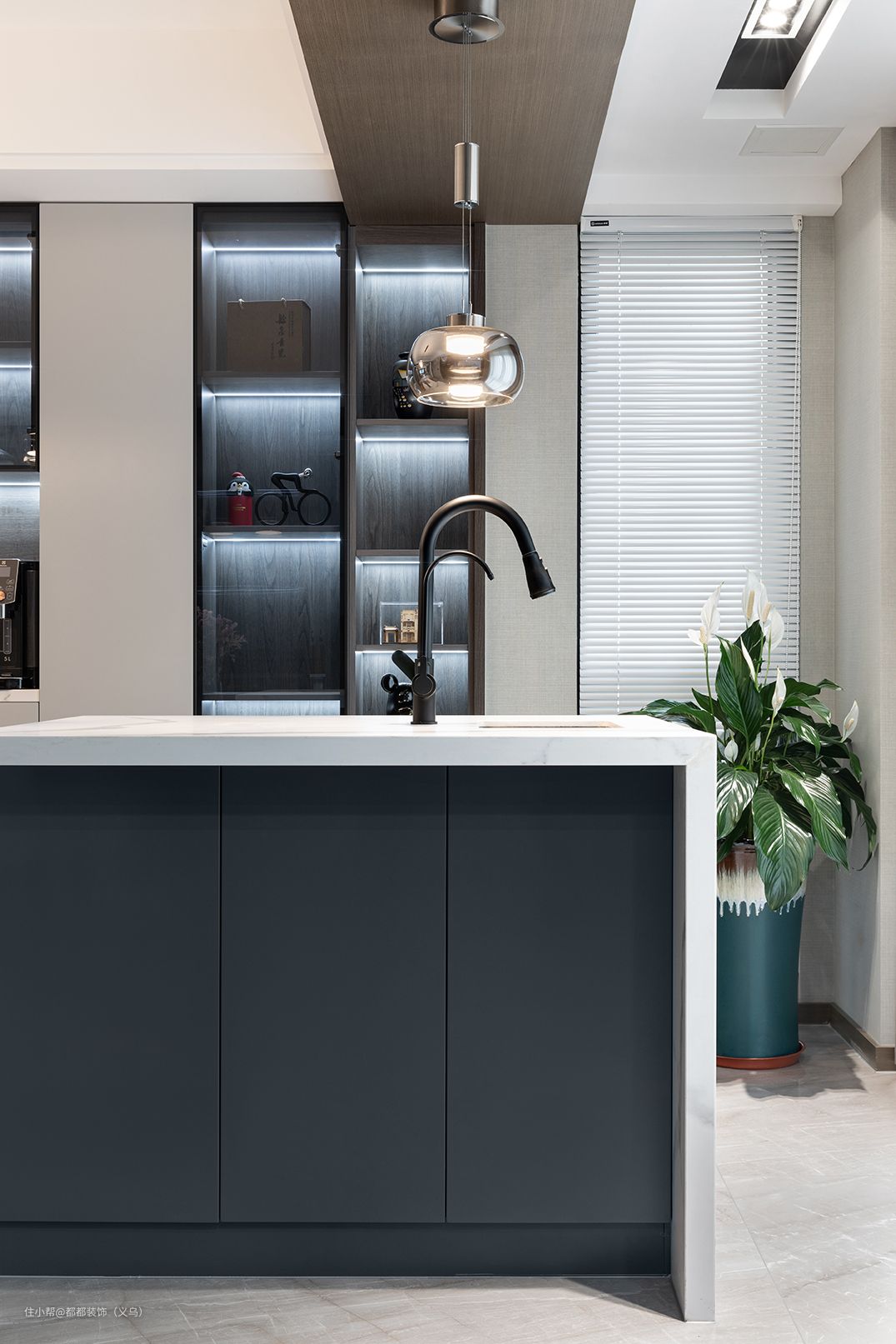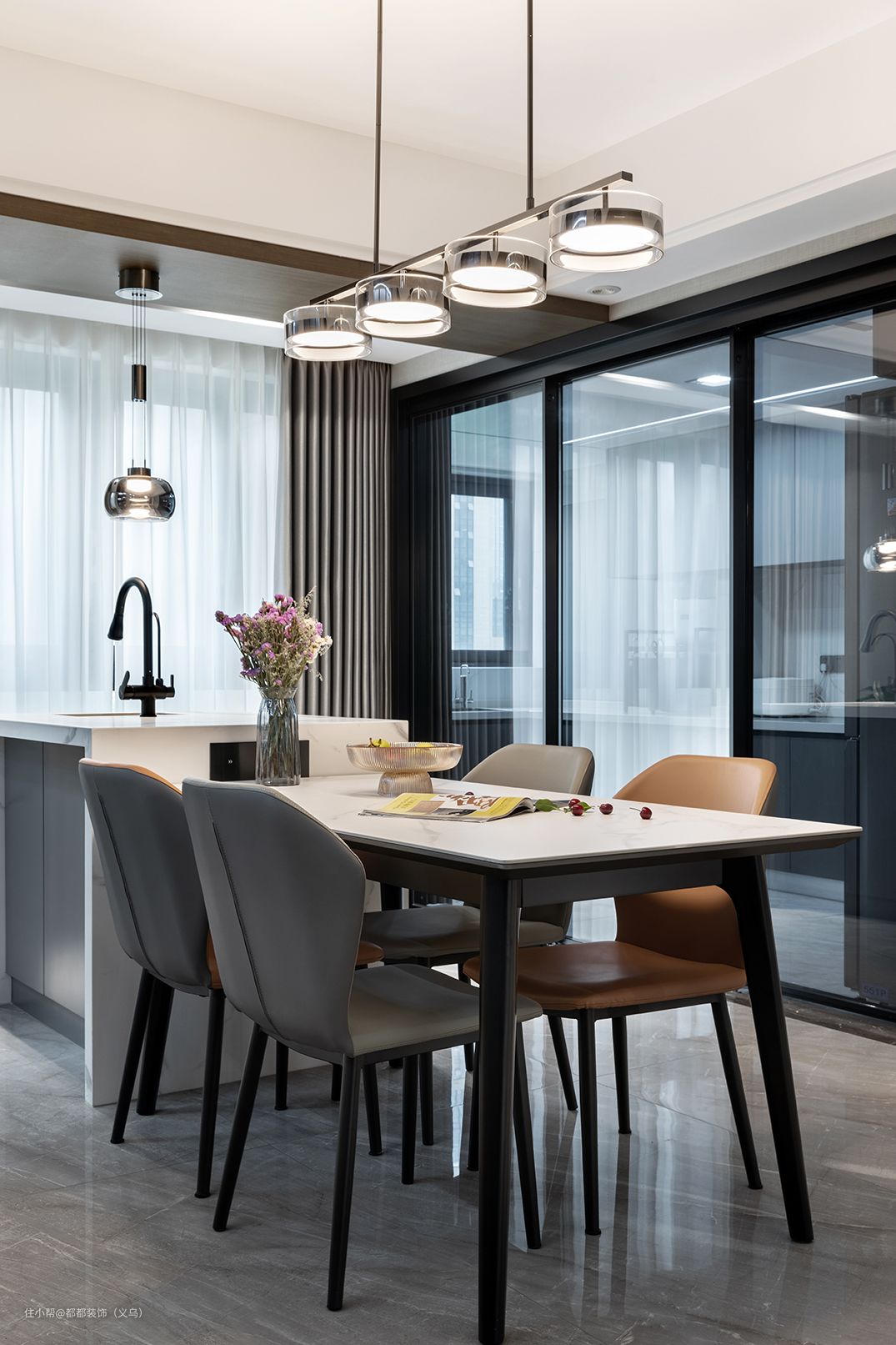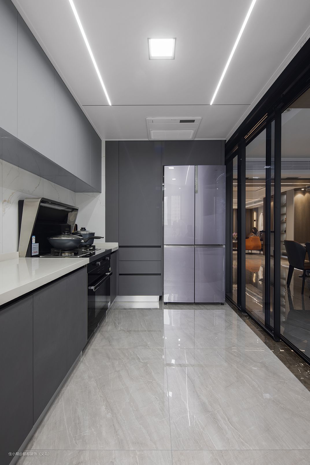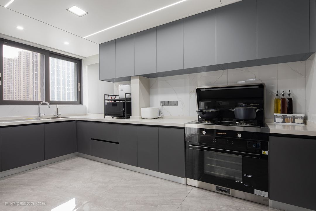 位于餐厅一旁的厨房门洞打通,设计成通透的玻璃移门,从而有效提升餐厨空间的敞亮感;U型厨房布局紧凑有序,动线舒适合理,上下双层柜体采用两种灰色拼色处理,简约中又不乏灵动感,同时充分了满足餐厨的储物需求。