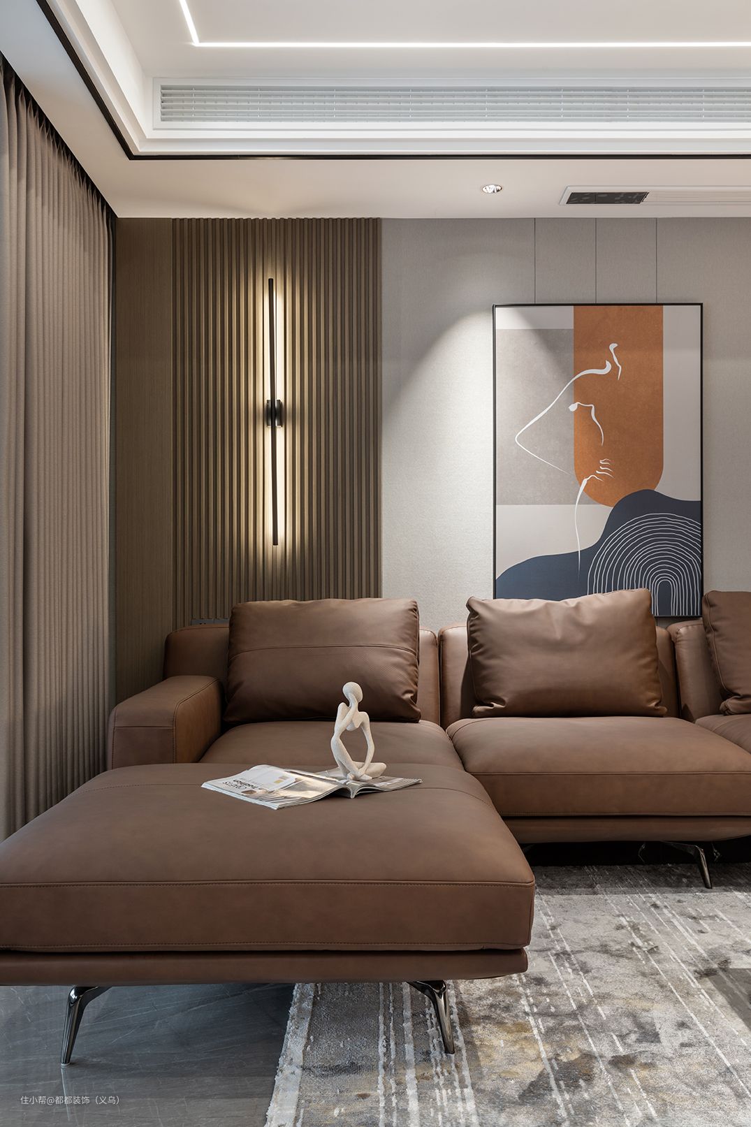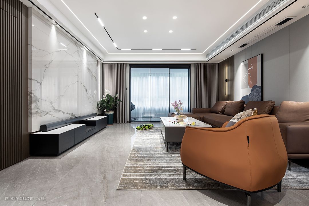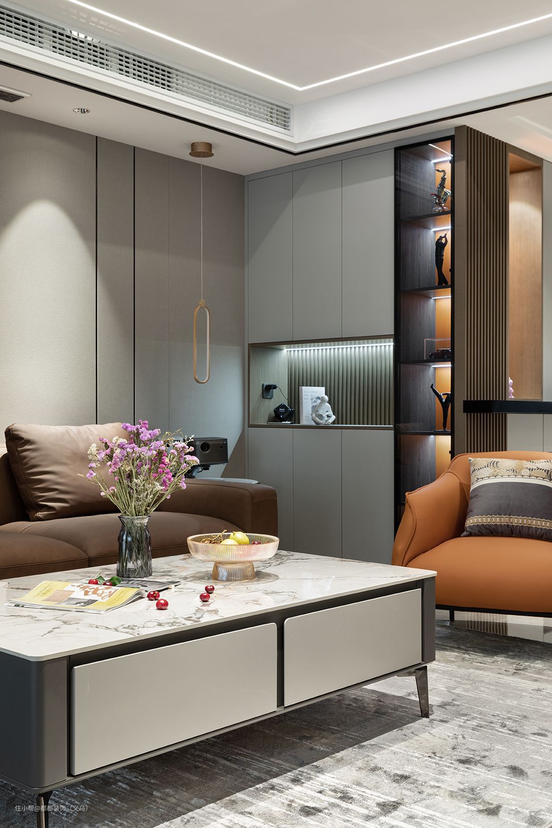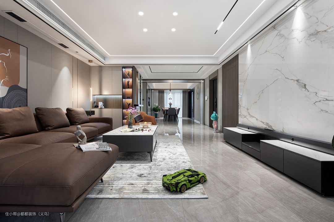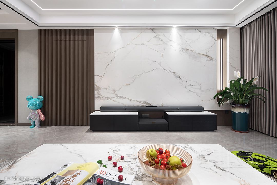 在快节奏的城市生活中,如何让家有治愈感,让漂泊的心有所寄托,我想这应该是曹设计师的追 求。家的仪式感,应该从踏入客厅开始,大理石元素的大气,灯带的温暖,都在渐渐打开施先生忙碌归来的心。 电视背景墙延续门厅的经典木饰面的基调,但在细节上选用了同色系的不同颜色,雪花白大理石与茶几台面相呼应,黑白色系的电视柜无论是从线条的优雅与色彩的选择,都透露出施先生居家的浪漫与小资洒脱的生活态度。