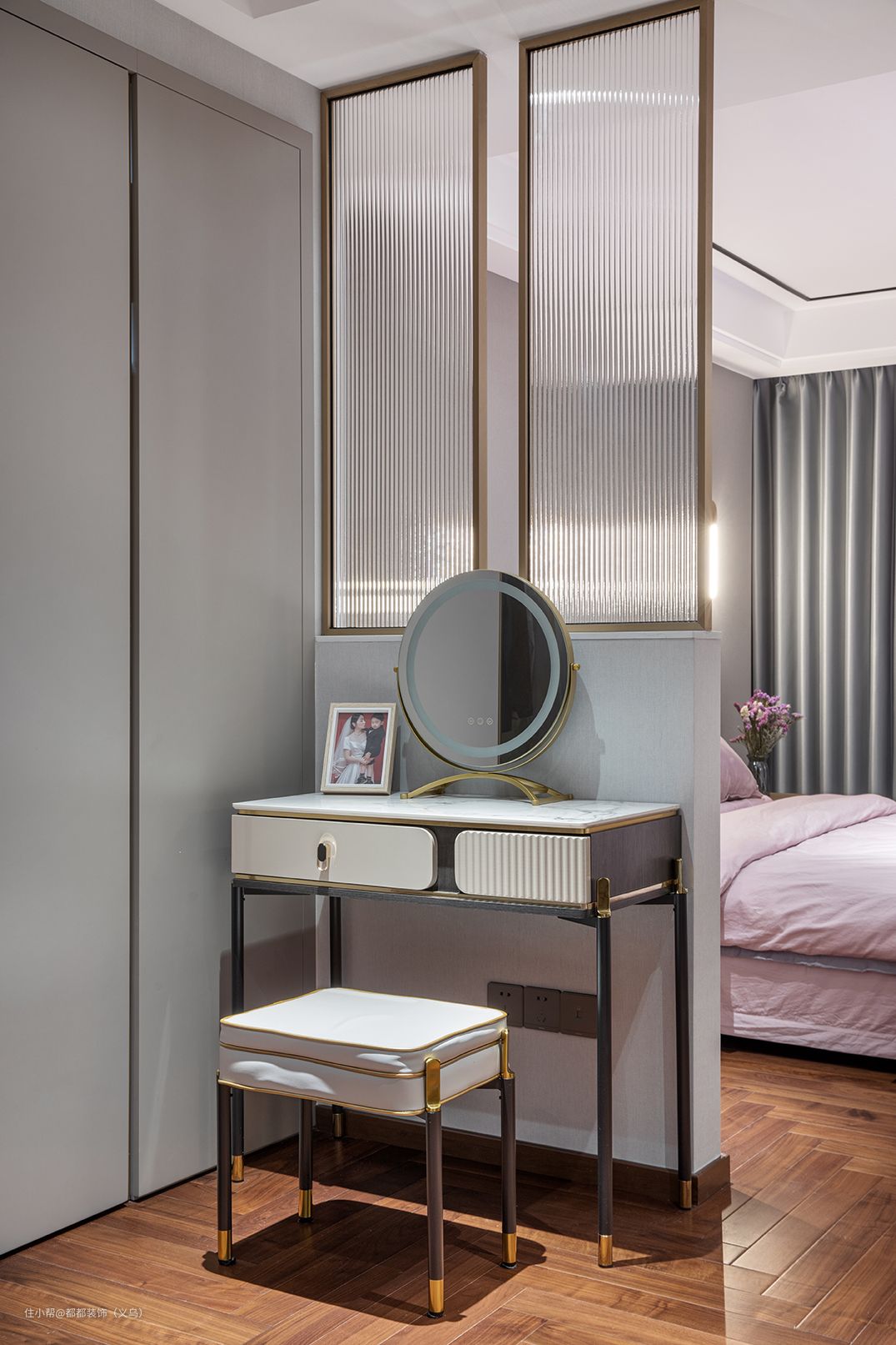 床头卡其色皮质软包和米灰色背景墙搭配得简约又温馨,一盏华丽轻盈的金属吊灯瞬间将空间照亮,光线的肆意碰撞让卧室精致又带着一丝浪漫。 半面墙体+长虹玻璃屏风巧妙隔出衣帽间和梳妆台,智能化妆镜放在40cm宽敞的岩板桌面上还绰绰有余,海量容量的抽屉,口红、粉饼、精华、面霜通通都能装下,桌椅脚统一选用烟熏橡木材质,精致又复古;留出两块玻璃门的衣橱恰当好处的展示常穿的衣服,拿取很方便。