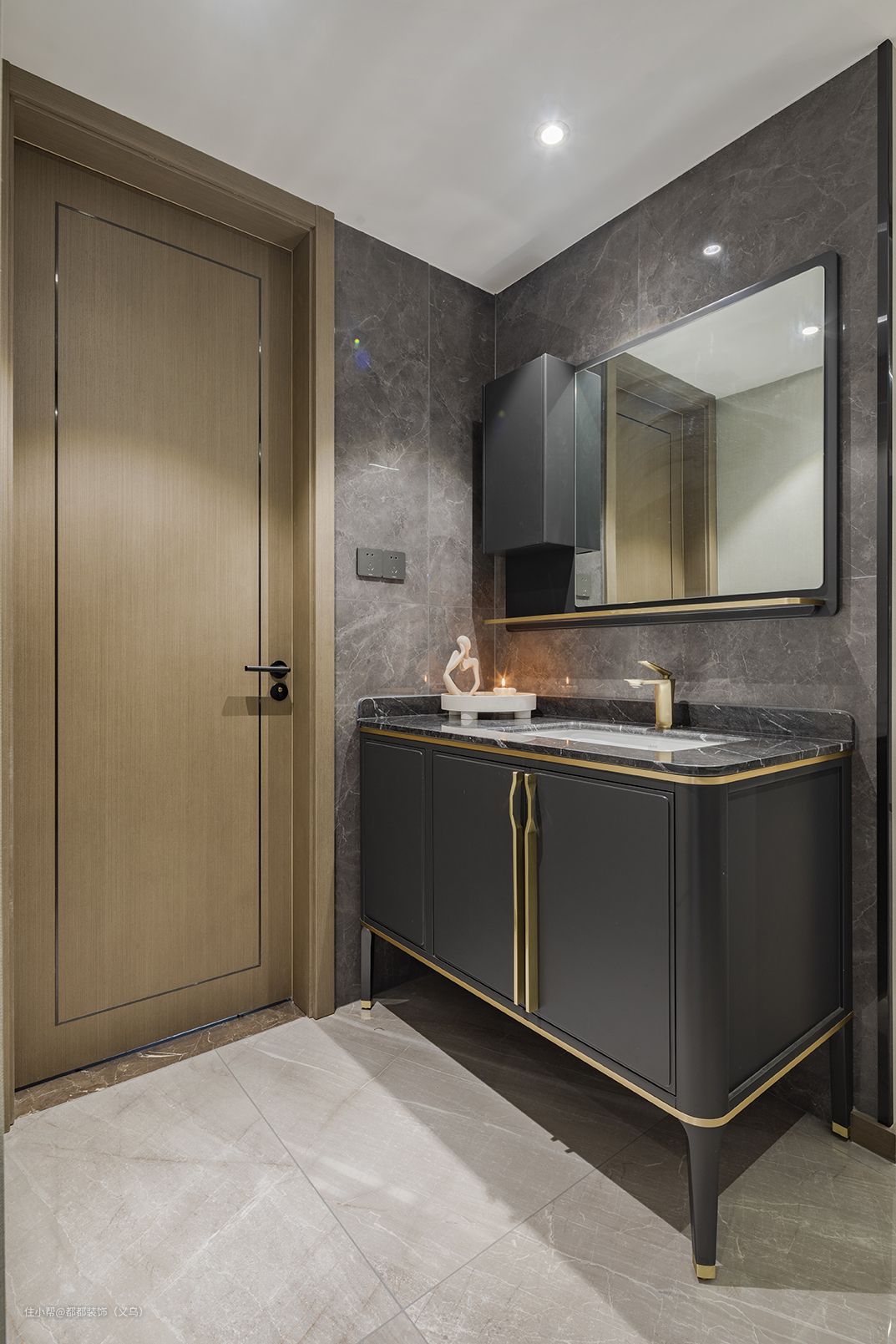 卫生间干区一眼望去宽敞通透,落地式岩板浴室柜用以金属边点缀,轻奢气质一下子呼之欲出。