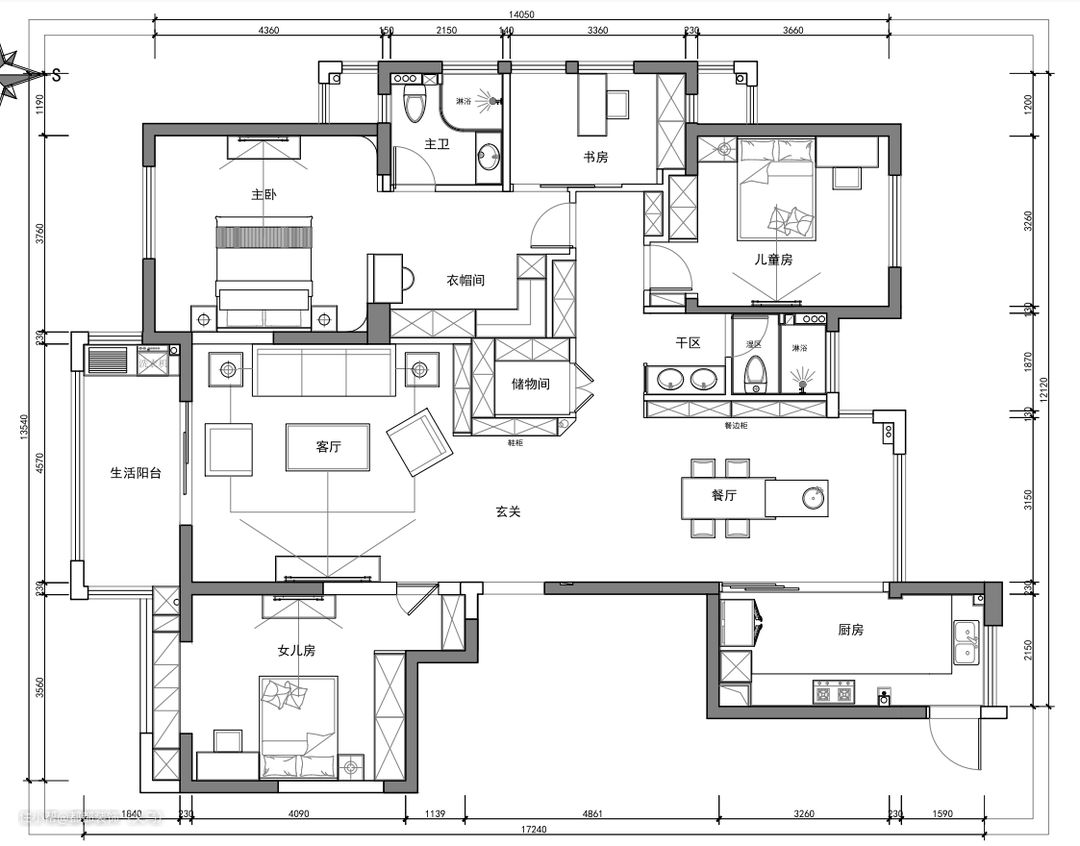 户型分析: 1.进门区域空荡,希望有更多的收纳空间; 2.原始格局入户对卫生间,风水不好,而且从主卧到主卫会路过公共区域,起夜上厕所或者平时来客人就会不方便; 3.原始书房是开放式布局,工作学习时会被噪音或者人员走动打扰。
