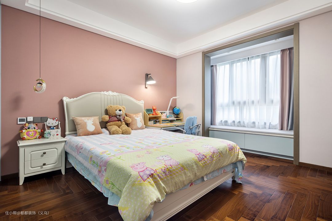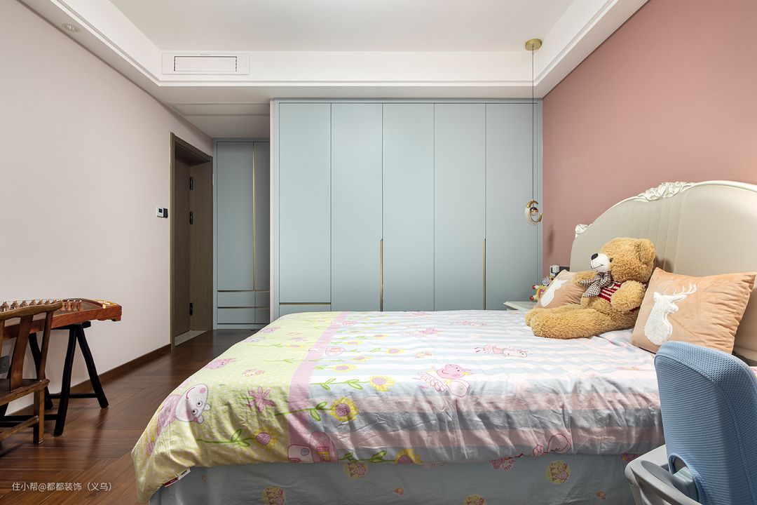 踏进房门的瞬间,就被清新可爱的氛围感所吸引;这个房间整体都是粉粉的,我看到的第一感觉就是梦幻,小女孩一定非常喜欢,住在里面也一定很幸福,时刻感觉自己是个小公主;泰迪熊也是现在流行的娃娃,床品的搭配也是很用心了,用灰色的床头板来平衡粉色的少女感,甜而不腻。