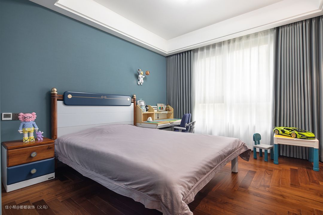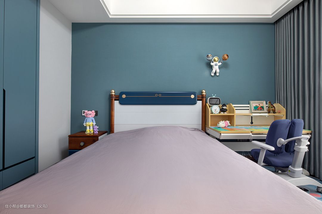儿子的卧室以雾霾蓝为主,纯净白色+淡雅木色营造出大自然的氛围,在硬装上,鱼骨拼接式地板、双眼皮吊项嵌入氛围灯,带来了舒服的视觉享受,床头加入一块有厚度的蓝色靠板,空间立体好看了也方便用来靠头。