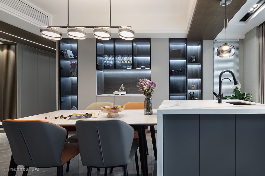 客厅过来就是餐厅,采用的是定制岛台+成品餐桌一体化设计,岛台可以充当餐桌辅助,在用餐的时候,若是把电饭煲、汤煲等放在餐桌上,可能会阻碍夹菜,而放在岛台上的话,就可以非常的方便了,颜值高还不压抑。