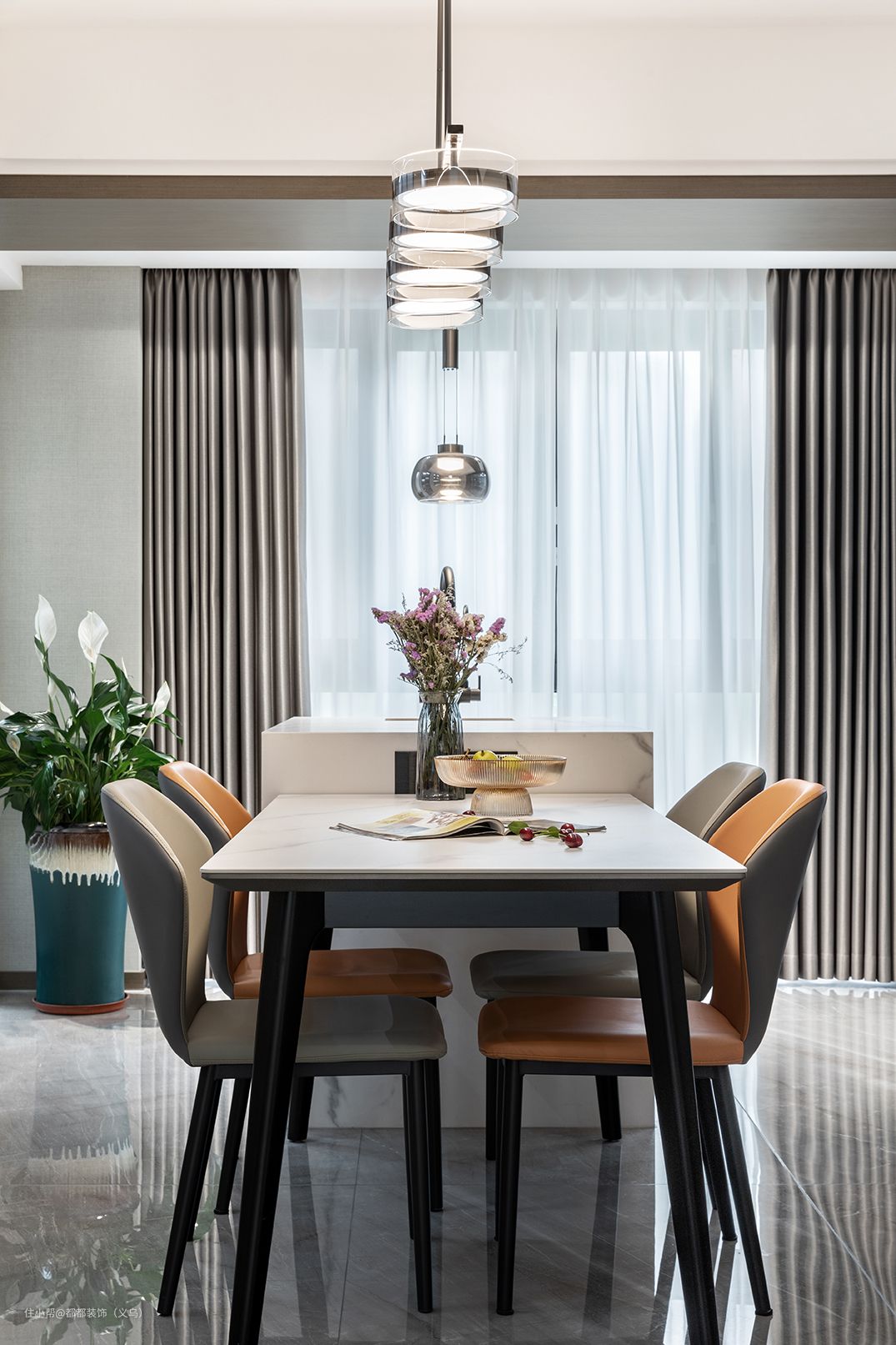 餐厅明亮的采光和浅色系装修,视感上非常赏心悦目,岛台中间预留了插座,方便使用小家电,或者临时在餐桌办公时,手机、电脑有充电的地方,不用求助于插排;桌面上装饰的花瓶也是设计感十足,插上几枝清新脱俗的干花,给整个家增添更多生机盎然的气息。