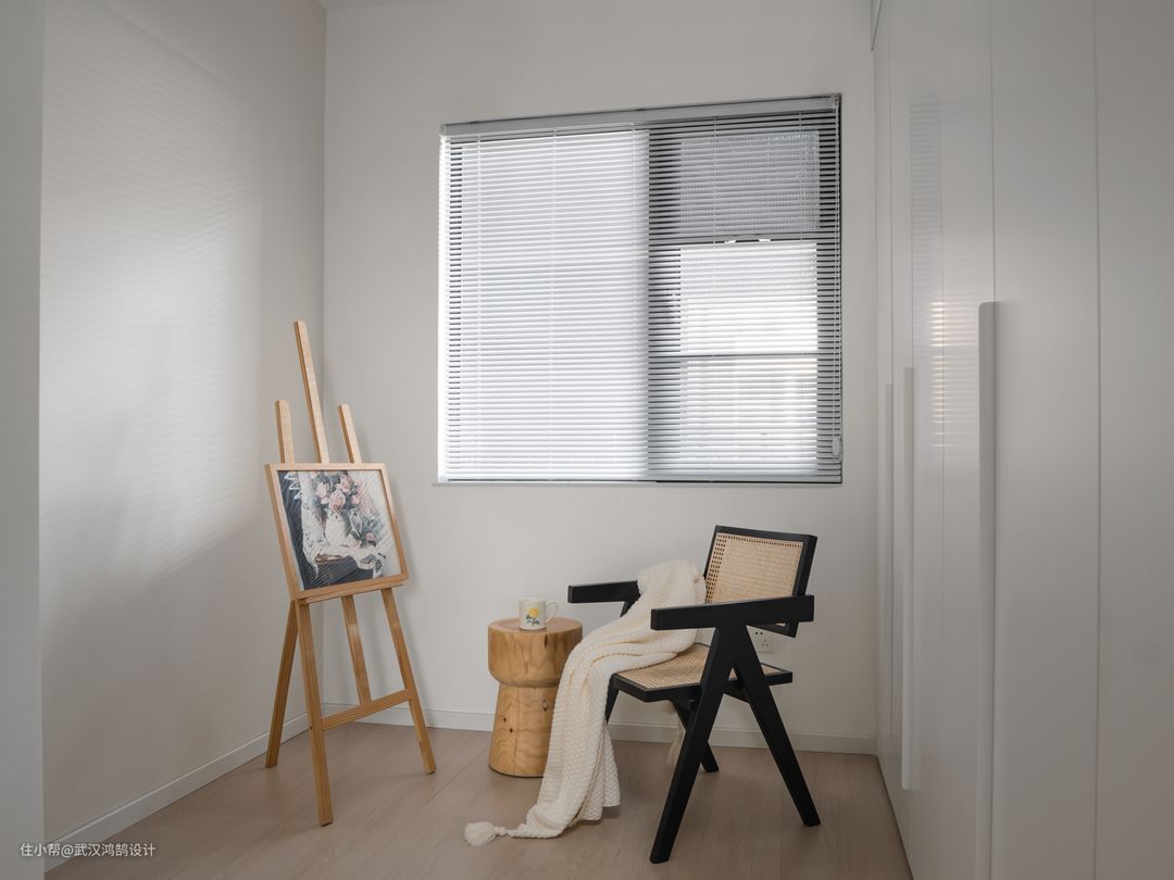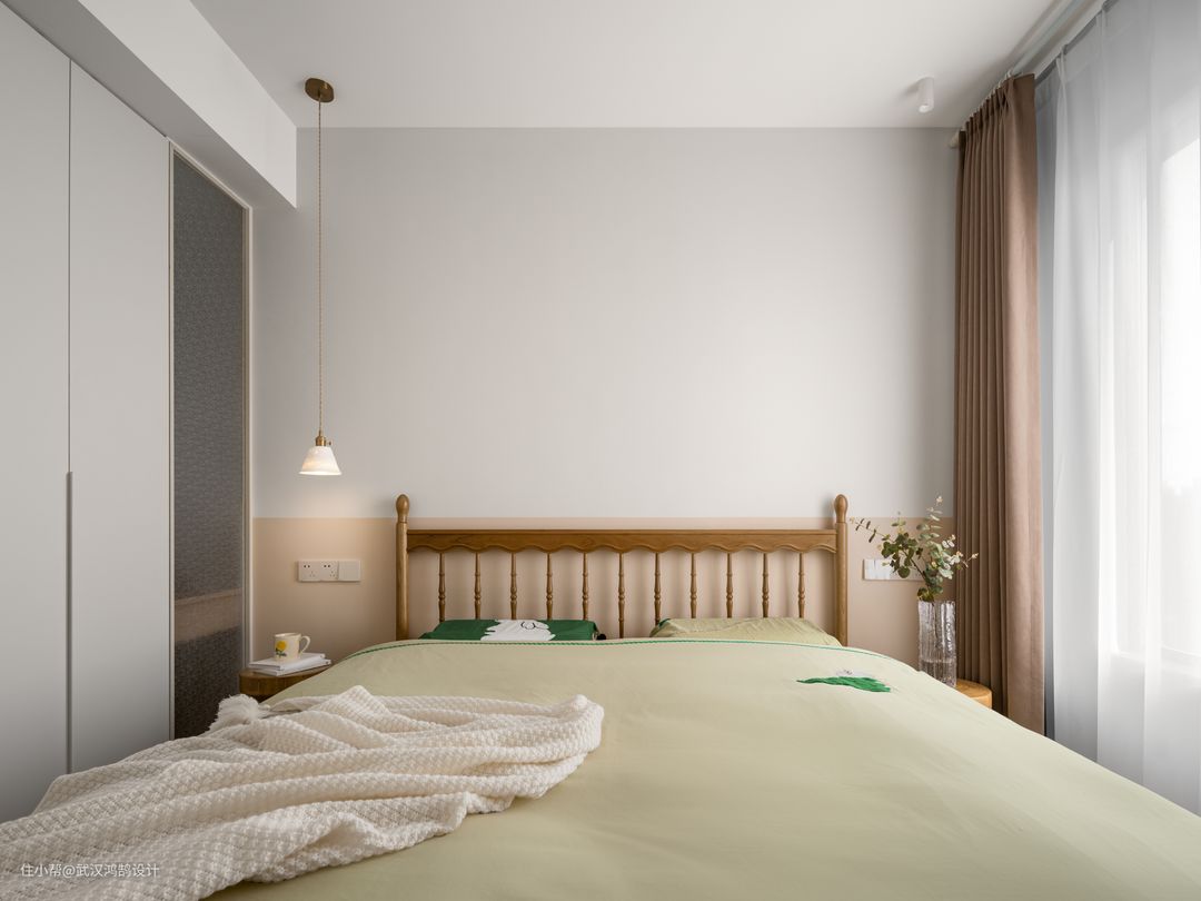 白色包裹的墙面,用奶咖色做半墙分色 整个主卧搭配注入春天的气息,让“白”的空间有了别的感觉 温柔的白纱,让阳光肆意倾泻洒落在地上,愈发明亮。主卧清爽的搭配,像是一包青黄瓜味薯片,有着别样的趣味。
