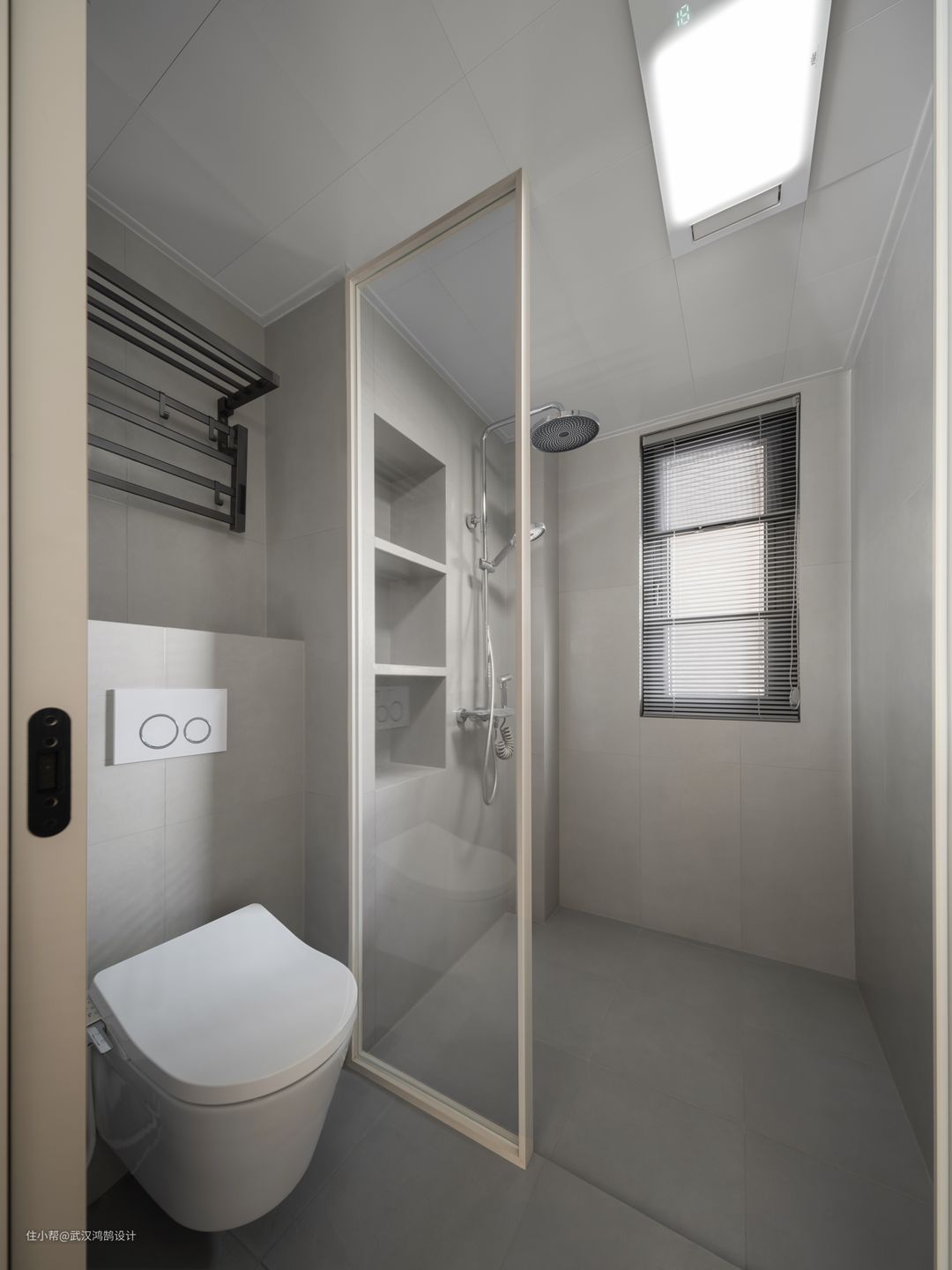 原始卫生间总面积4m²,干区1.4m²: 湿区:2.5m²,我们把原始卫生间全部整合为了湿区,规划了下沉式淋浴区、壁挂马桶,玻璃隔断、壁龛、电热毛巾架....把多功能房0.5m²拿出来,让干区外移,悬挂式浴室柜、浴室镜.....真正做到了干湿分离,简洁实用方便。
