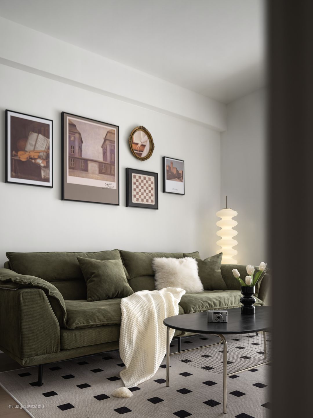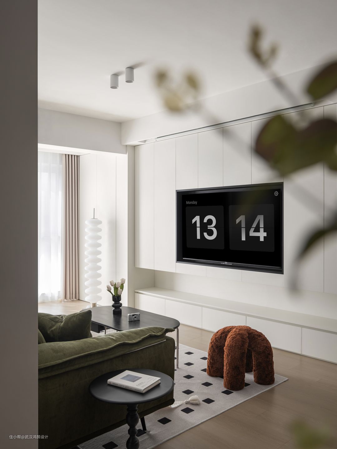 客厅可盐可甜的北欧风,没有繁复的线条和大平顶,直接用大面积的白色展现出空间的简洁、舒适、自然,打造清新自然的「盐系」氛围,高饱和度的复古软装搭配增添「甜系」气质, 整面电视墙的设计是兼具实用与美感的储物柜,悬空的电视柜与高柜之间挑空,连接造型又具有呼吸感