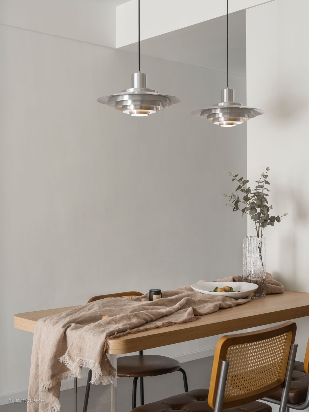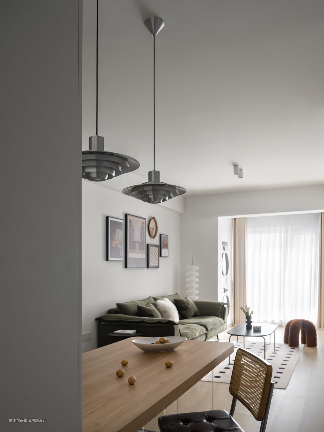 整体风格是北欧+原木风,妍喜欢北欧的干净通透,又爱原木的自然清晰,整屋也是白为主色,原木作为点缀,1.5m*0.75m的木质餐桌搭配丹麦P376吊灯,柔和的漫射光搭配浅色空间,耐看又具有安静的高级感
