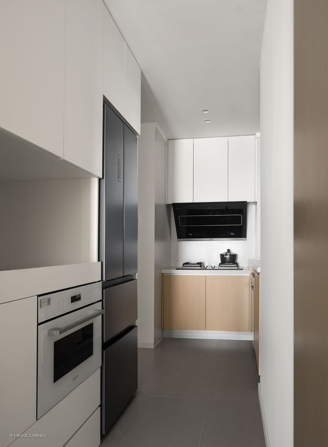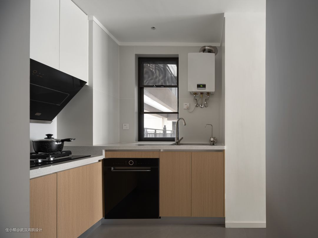 从玄关进入室内空间,依次是厨房、餐厅、客厅,狭长的空间以白色为主色调,用最纯粹的白去反射出变化的自然光线, 原始厨房面积只有3.7m²,我们拆除了1.2m侧墙,和一个门洞,把厨房打开做成L型开放式,空间立刻就明亮起来。 为了更好的利用空间从右至左,分别是清洗区、切配区、烹饪区,双动线合理 当然这样的空间依旧无法满足厨房的一个收纳需求,我们在餐厨之间制作一组1.45m*0.65m到顶的半开式收纳柜,作为厨房的延伸,同时兼顾橱柜、餐边柜的功能,自然的将空间串联起来,将收纳融入到整体之中