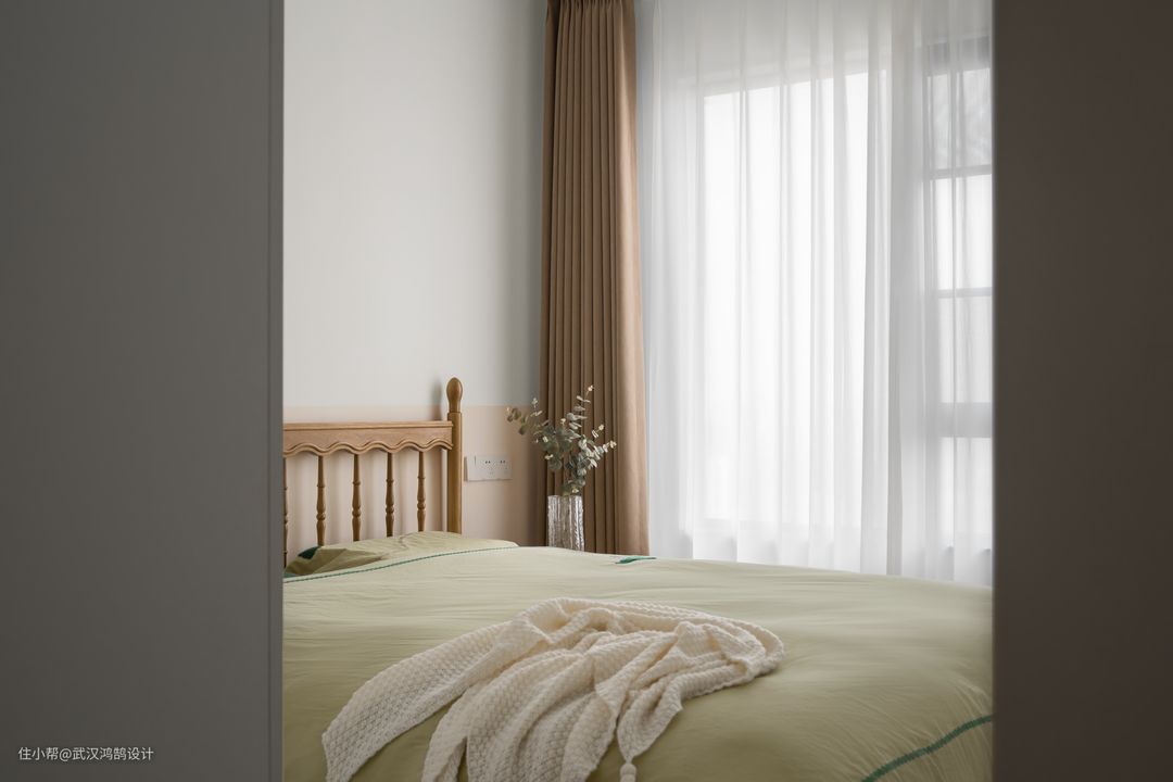 白色包裹的墙面,用奶咖色做半墙分色 整个主卧搭配注入春天的气息,让“白”的空间有了别的感觉 温柔的白纱,让阳光肆意倾泻洒落在地上,愈发明亮。主卧清爽的搭配,像是一包青黄瓜味薯片,有着别样的趣味。