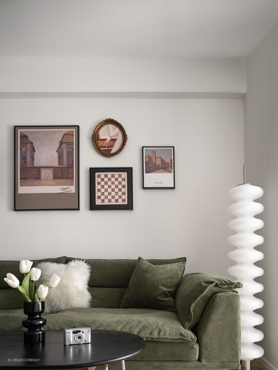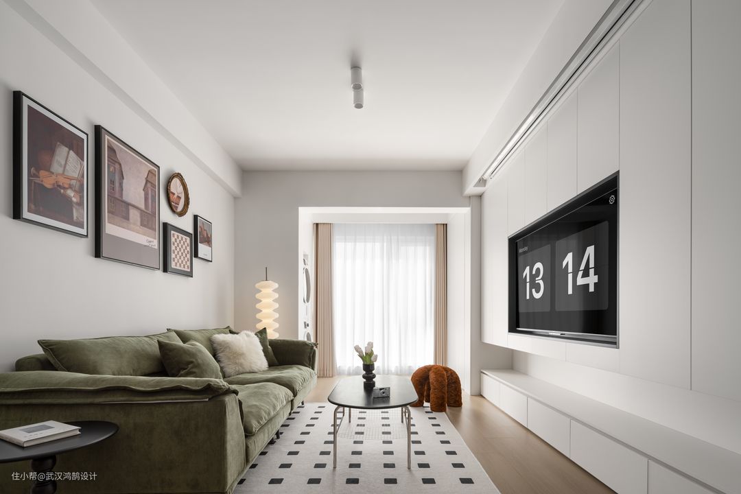 客厅可盐可甜的北欧风,没有繁复的线条和大平顶,直接用大面积的白色展现出空间的简洁、舒适、自然,打造清新自然的「盐系」氛围,高饱和度的复古软装搭配增添「甜系」气质, 整面电视墙的设计是兼具实用与美感的储物柜,悬空的电视柜与高柜之间挑空,连接造型又具有呼吸感